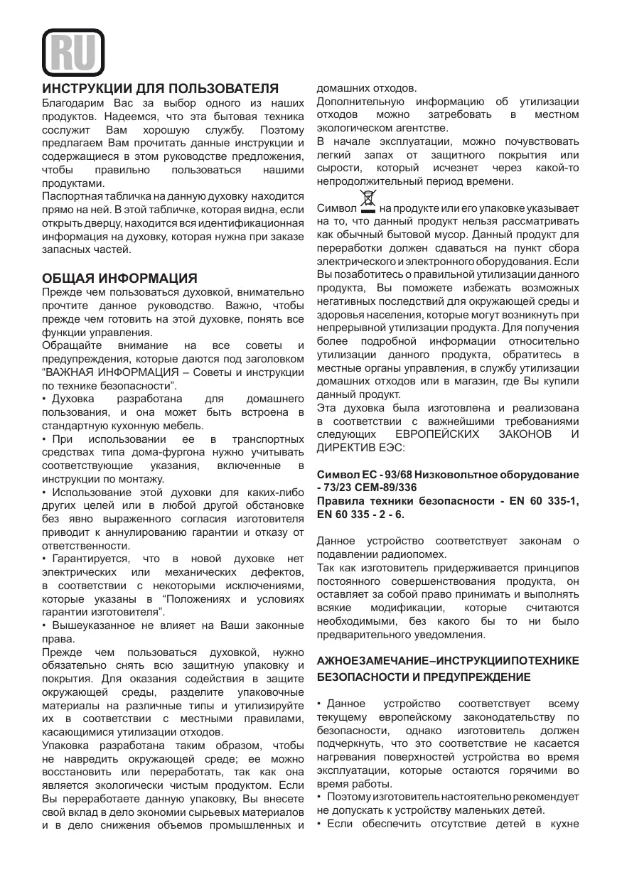 экологическом агентстве. В начале эксплуатации, можно почувствовать легкий запах от защитного покрытия или сырости, который исчезнет через какой-то непродолжительный период времени. на продукте или его упаковке указывает на то, что данный продукт нельзя рассматривать как обычный бытовой мусор. Данный продукт для переработки должен сдаваться на пункт сбора электрического и электронного оборудования. Если Вы позаботитесь о правильной утилизации данного продукта, Вы поможете избежать возможных негативных последствий для окружающей среды и здоровья населения, которые могут возникнуть при непрерывной утилизации продукта. Для получения более подробной информации относительно утилизации данного продукта, обратитесь в местные органы управления, в службу утилизации домашних отходов или в магазин, где Вы купили данный продукт. Эта духовка была изготовлена и реализована в соответствии с важнейшими требованиями ЕВРОПЕЙСКИХ