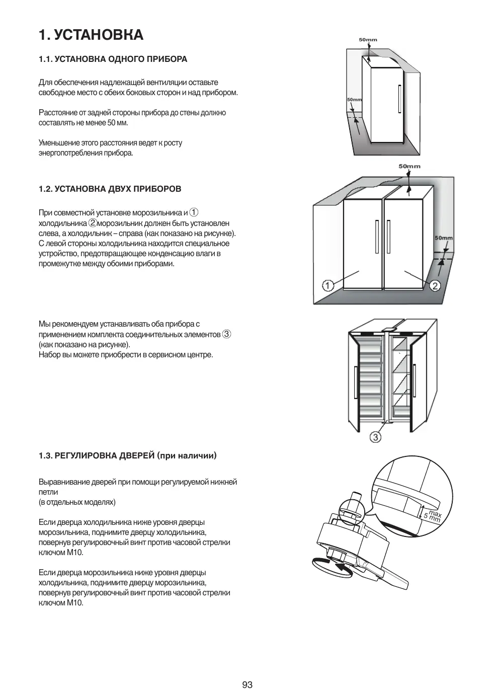 1.2. INSTALLATION DE DEUX APPAREILS Durant l'installation du congélateur 1 et du réfrigérateur 2 , assurez-vous que le congélateur est placé à gauche et le réfrigérateur à droite (comme illustré sur l'image). Sur le côté gauche du réfrigérateur se trouve un dispositif spécial permettant d'éviter les problèmes de condensation entre les appareils.
