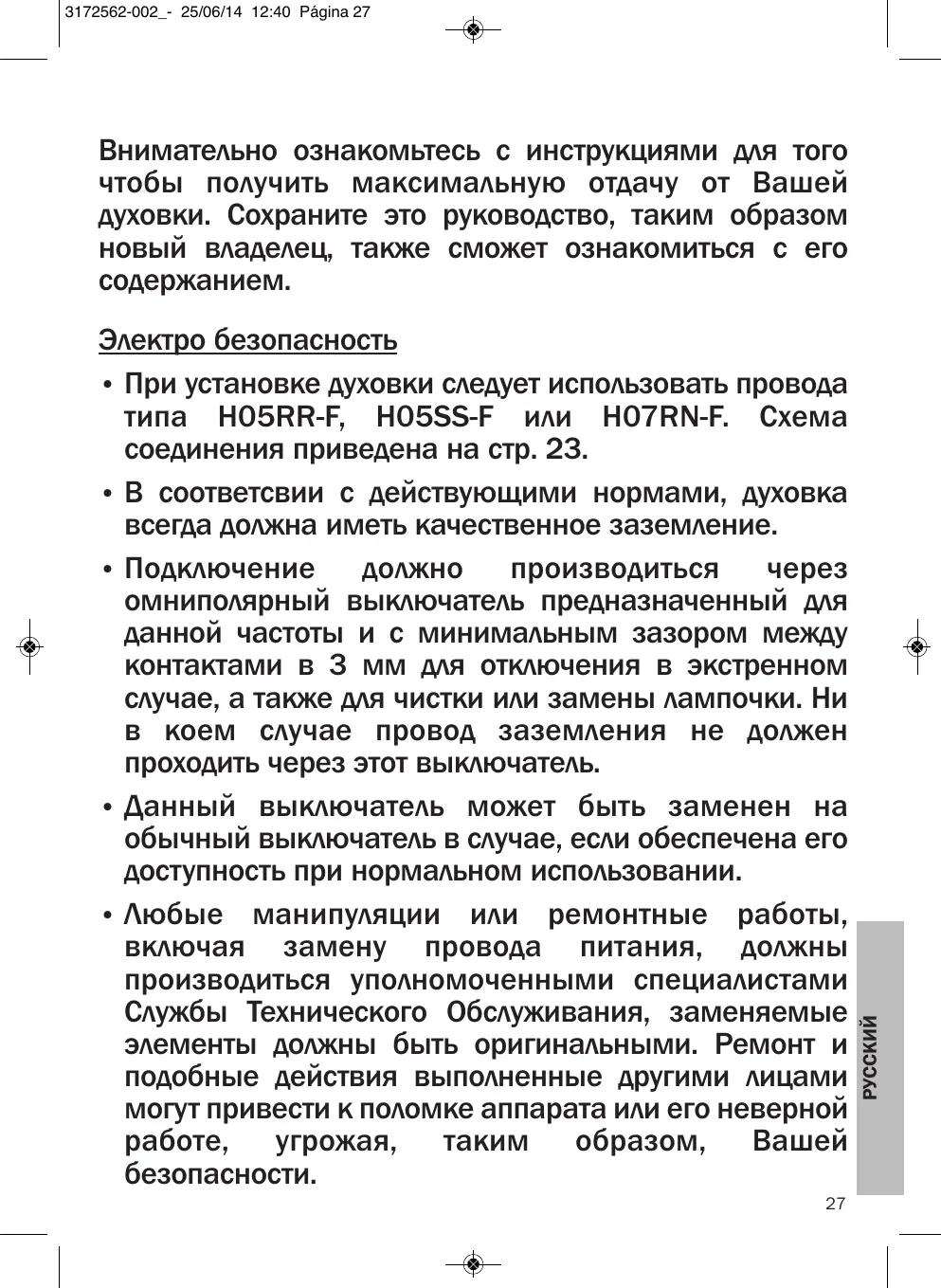 - При установке духовки салдует Испобьть пювда Тира H05RR-F, H05SS-F Или H07RN-F. Схема-coединения рпвedeна настp. 23.