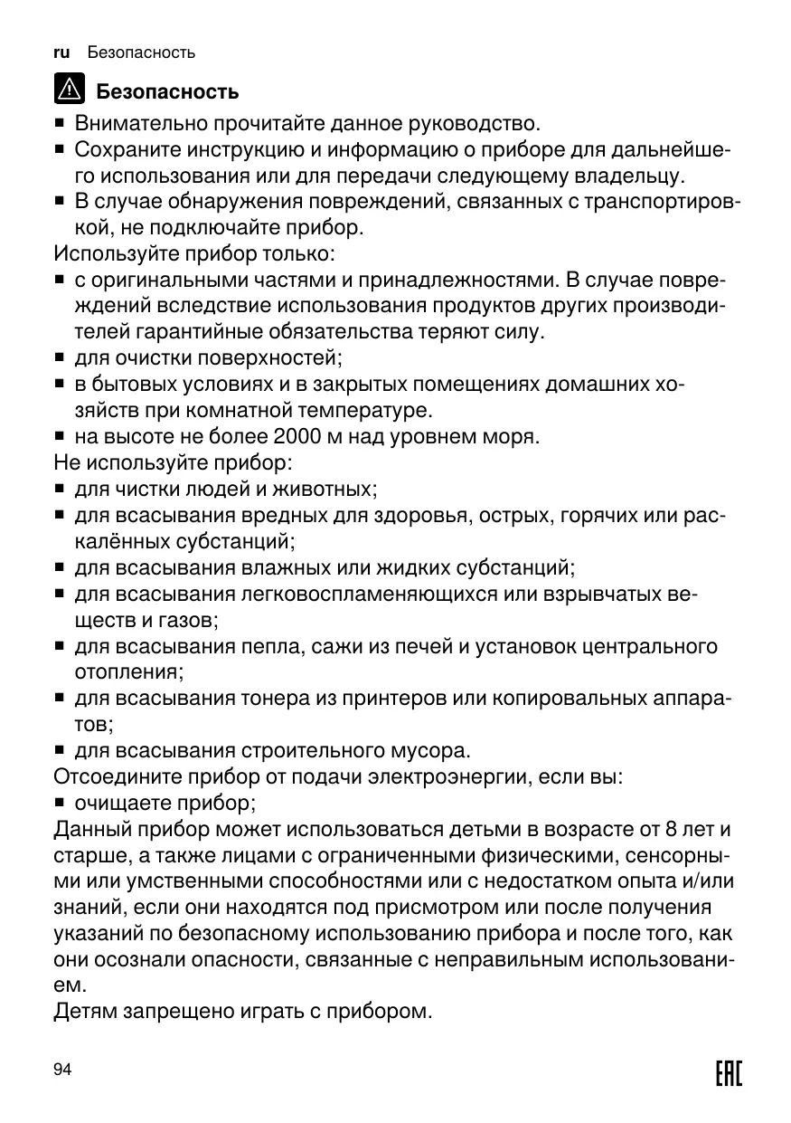 ¡ avec des pièces et accessoires d’origine. En cas de dommages dus à l’utilisation de produits tiers, le droit à la garantie expire. ¡ pour nettoyer les surfaces. ¡ pour un usage domestique privé et dans les pièces fermées d’un domicile, à la température ambiante. ¡ jusqu'à une altitude maximale de 2000 m au-dessus du niveau de la mer. N’utilisez pas l’appareil : ¡ pour l’aspiration de personnes et d’animaux. ¡ pour l’aspiration de substances nocives pour la santé, aux arêtes vives, chaudes ou brûlantes. ¡ pour l’aspiration de substances humides ou liquides. ¡ pour l’aspiration de substances et gaz légèrement inflammables ou explosibles. ¡ pour l’aspiration de cendres, de la suie de four et d’installations de chauffage central. ¡ pour l’aspiration de poussières de toner des imprimantes et copieurs. ¡ pour l’aspiration de débris de construction. Débranchez l’appareil du secteur lorsque : ¡ vous nettoyez l’appareil. Les enfants de 8 ans et plus, les personnes souffrant d’un handicap physique, sensoriel ou mental ou ne détenant pas l’expérience et/ou les connaissances nécessaires pourront utiliser cet appareil à condition de le faire sous surveillance, ou que son utilisation sûre leur ait été enseignée et qu’ils aient compris les dangers qui en émanent. Les enfants ne sont pas autorisés à jouer avec l'appareil. 20