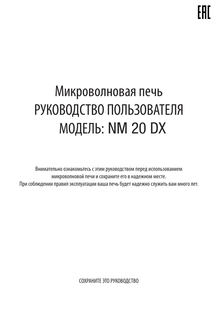 Микроволновая печь РУКОВОДСТВО ПОЛЬЗОВАТЕЛЯ МОДЕЛЬ: NM 20 DX Внимательно ознакомьтесь с этим руководством перед использованием микроволновой печи и сохраните его в надежном месте. При соблюдении правил эксплуатации ваша печь будет надежно служить вам много лет.