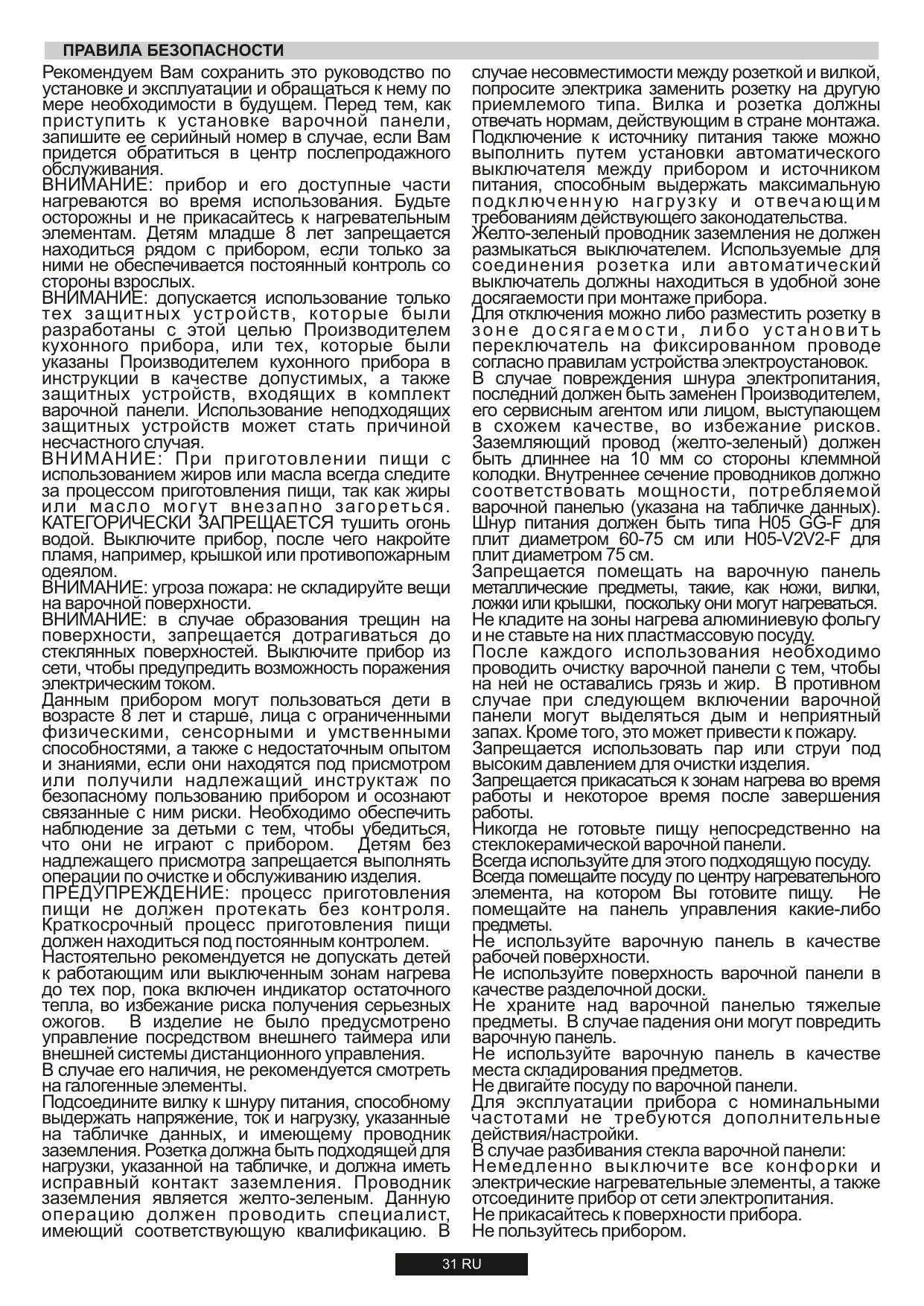 AVERTISSEMENT : l'appareil et ses parties accessibles chauffent pendant l'utilisation. Évitez de toucher les éléments chauffants. Les enfants de moins de 8 ans doivent être tenus hors de portée de l'appareil, sauf s'ils sont surveillés en permanence. AVERTISSEMENT : n'utilisez qu'un dispositif de protection de votre table de cuisson conçu par le fabricant de votre appareil ou indiqué, dans le manuel d'utilisation, comme étant compatible, ou bien le dispositif de protection fourni avec l'appareil. L'utilisation d'un dispositif de protection non approprié peut causer des accidents. AVERTISSEMENT : l'utilisation de la table de cuisson sans surveillance avec manipulation de graisse ou d'huile peut être dangereux et provoquer un incendie. N'essayez JAMAIS d'éteindre un feu avec de l'eau, mais éteignez l'appareil, puis couvrez la flamme avec un couvercle ou une couverture anti-feu, par exemple. AVERTISSEMENT, risque d'incendie : ne stockez pas d'éléments sur les surfaces de cuisson. AVERTISSEMENT : si la surface est fissurée, ne touchez pas le verre de la table et éteignez l'appareil pour éviter tout risque d'électrocution. Cet appareil peut être utilisé par des enfants âgés de 8 ans et plus, par des personnes dont les capacités physiques, sensorielles ou mentales sont réduites ou par des personnes dénuées d'expérience et de connaissances, mais qui ont été informées sur la manière d'utiliser l'appareil en toute sécurité, si elles comprennent les risques impliqués. Surveillez les enfants afin qu'ils ne jouent pas avec l'appareil. L'entretien et le nettoyage ne doivent pas être effectués par des enfants sans surveillance. ATTENTION : la cuisson demande d'être surveillée. Les cuissons de courte durée doivent être surveillées en permanence. Il est chaudement recommandé d'éloigner les enfants de la zone de cuisson lorsqu'elle fonctionne ou même quand elle est éteinte, mais que l'indicateur de chaleur résiduelle est encore visible, afin d'éviter tout risque de brûlures graves. Cet appareil n'est pas conçu pour être actionné par un temporisateur externe ou un système séparé de commande à distance. Si votre table de cuisson est dotée d'éléments halogènes, n'en fixez pas la lumière. Brancher le câble d'alimentation sur une prise de courant qui supporte le voltage (le courant et la charge sont indiqués sur l'étiquette) et vérifier la présence d'une mise à la terre. La prise d'alimentation doit supporter la charge indiquée sur l'étiquette et être dotée d'une mise à la terre en état de fonctionnement. Le câble conducteur de mise à la terre est jaune et vert. Cette opération doit être exécutée par du personnel qualifié. En cas d'incompatibilité entre la prise d'alimentation et la fiche du câble de l'appareil, demander à un électricien professionnel de remplacer la prise d'alimentation par un dispositif compatible. La fiche du câble d'alimentation et la prise d'alimentation doivent être conformes aux normes en vigueur dans le pays d'installation. 06 FR