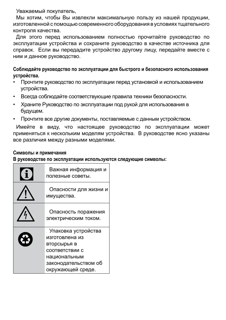 Avertissement relatif aux conditions dangereuses pour la vie et la propriété, Risque d'électrocution, L'emballage de l'appareil a été fabriqué à partir de matériaux recyclables, conformément à la législation nationale en matière d'environnement,