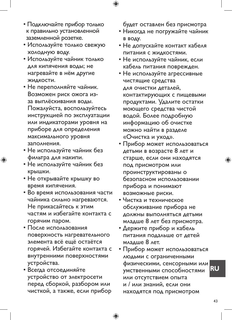 • L’appareil doit toujours être débranché du secteur lorsqu‘il est laissé sans surveillance ou avant de le monter, de le démonter ou de le nettoyer. • Pendant le fonctionnement, des parties de l‘appareil, comme la sortie de la vapeur au niveau du filtre, peuvent devenir très chaudes. Éviter de toucher ces parties et tout contact avec la vapeur chaude. • Ne pas ouvrir le porte-filtre pendant la préparation. • La plaque chauffante devient très chaude pendant le fonctionnement et reste chaude pendant longtemps après la préparation. Tout contact avec la plaque chauffante peut causer des brûlures et doit donc être évité. • S’assurer que le cordon d‘alimentation n‘entre pas en contact avec la plaque chauffante. • Ne pas utiliser l‘appareil si le cordon d‘alimentation est endommagé. • Le cordon d’alimentation ne doit en aucun cas entrer en contact avec des liquides. • Ne jamais plonger l‘appareil dans l‘eau. • Ne pas mettre la verseuse au micro-ondes. • Ne pas nettoyer les parties entrant en contact avec de la nourriture avec des produits de nettoyage agressifs ou une crème à récurer. Nettoyer les résidus de détergent à l‘eau claire.