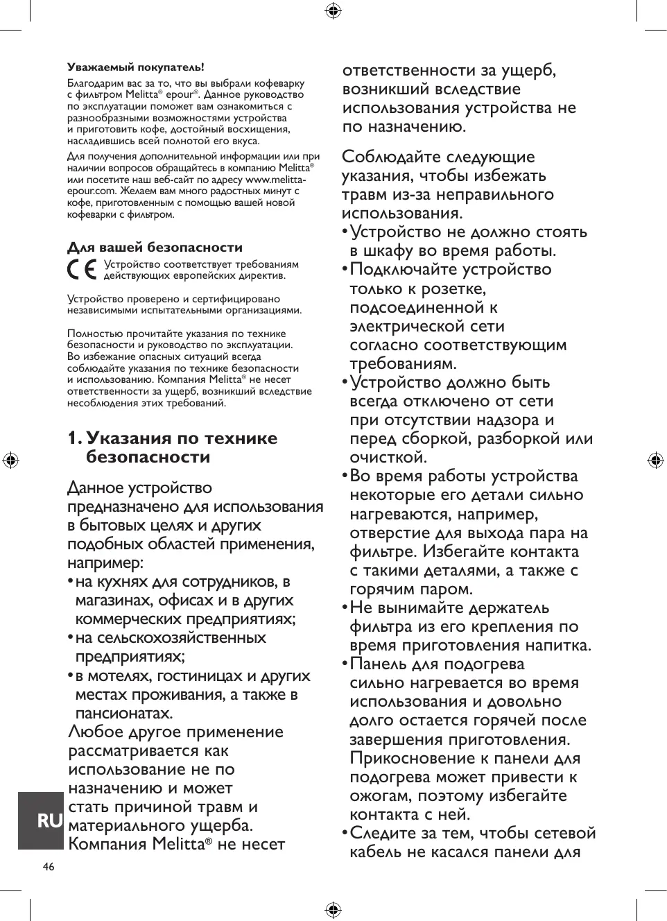 Соблюдайте следующие указания, чтобы избежать травм из-за неправильного использования. • Устройство не должно стоять Для вашей безопасности в шкафу во время работы. Устройство соответствует требованиям • Подключайте устройство действующих европейских директив. только к розетке, Устройство проверено и сертифицировано подсоединенной к независимыми испытательными организациями. электрической сети Полностью прочитайте указания по технике безопасности и руководство по эксплуатации. согласно соответствующим Во избежание опасных ситуаций всегда требованиям. соблюдайте указания по технике безопасности и использованию. Компания Melitta не несет • Устройство должно быть ответственности за ущерб, возникший вследствие несоблюдения этих требований. всегда отключено от сети при отсутствии надзора и 1. Указания по технике перед сборкой, разборкой или безопасности очисткой. • Во время работы устройства Данное устройство некоторые его детали сильно предназначено для использования нагреваются, например, в бытовых целях и других отверстие для выхода пара на подобных областей применения, фильтре. Избегайте контакта например: с такими деталями, а также с • на кухнях для сотрудников, в горячим паром. магазинах, офисах и в других • Не вынимайте держатель коммерческих предприятиях; фильтра из его крепления по • на сельскохозяйственных время приготовления напитка. предприятиях; • Панель для подогрева • в мотелях, гостиницах и других сильно нагревается во время местах проживания, а также в использования и довольно пансионатах. долго остается горячей после Любое другое применение завершения приготовления. рассматривается как Прикосновение к панели для использование не по подогрева может привести к назначению и может ожогам, поэтому избегайте стать причиной травм и контакта с ней. RU материального ущерба. • Следите за тем, чтобы сетевой Компания Melitta® не несет кабель не касался панели для ®