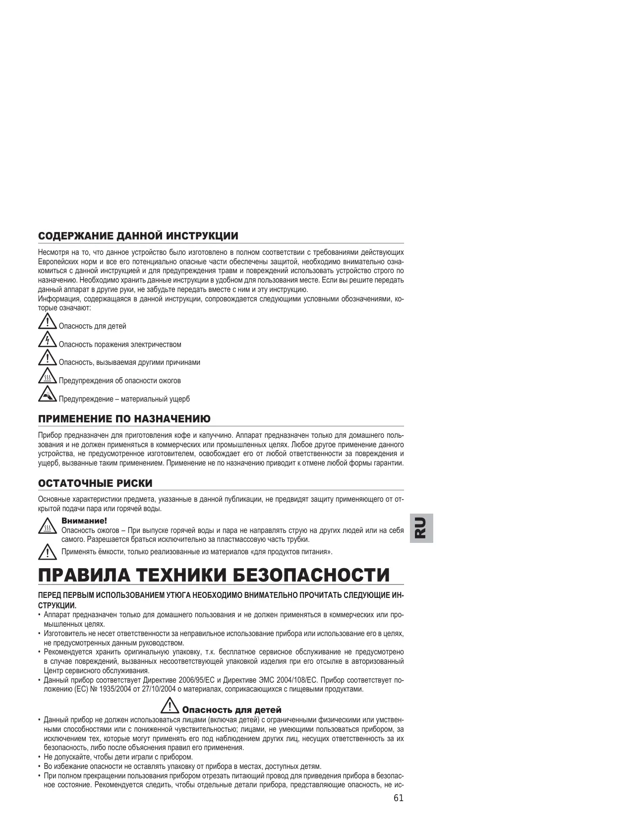 ПРАВИЛА ТЕХНИКИ БЕЗОПАСНОСТИ ПЕРЕД ПЕРВЫМ ИСПОЛЬЗОВАНИЕМ УТЮГА НЕОБХОДИМО ВНИМАТЕЛЬНО ПРОЧИТАТЬ СЛЕДУЮЩИЕ ИНСТРУКЦИИ. • Аппарат предназначен только для домашнего пользования и не должен применяться в коммерческих или промышленных целях. • Изготовитель не несет ответственности за неправильное использование прибора или использование его в целях, не предусмотренных данным руководством. • Рекомендуется хранить оригинальную упаковку, т.к. бесплатное сервисное обслуживание не предусмотрено в случае повреждений, вызванных несоответствующей упаковкой изделия при его отсылке в авторизованный Центр сервисного обслуживания. • Данный прибор соответствует Директиве 2006/95/EC и Директиве ЭMC 2004/108/EC. Прибор соответствует положению (EC) № 1935/2004 от 27/10/2004 о материалах, соприкасающихся с пищевыми продуктами.
