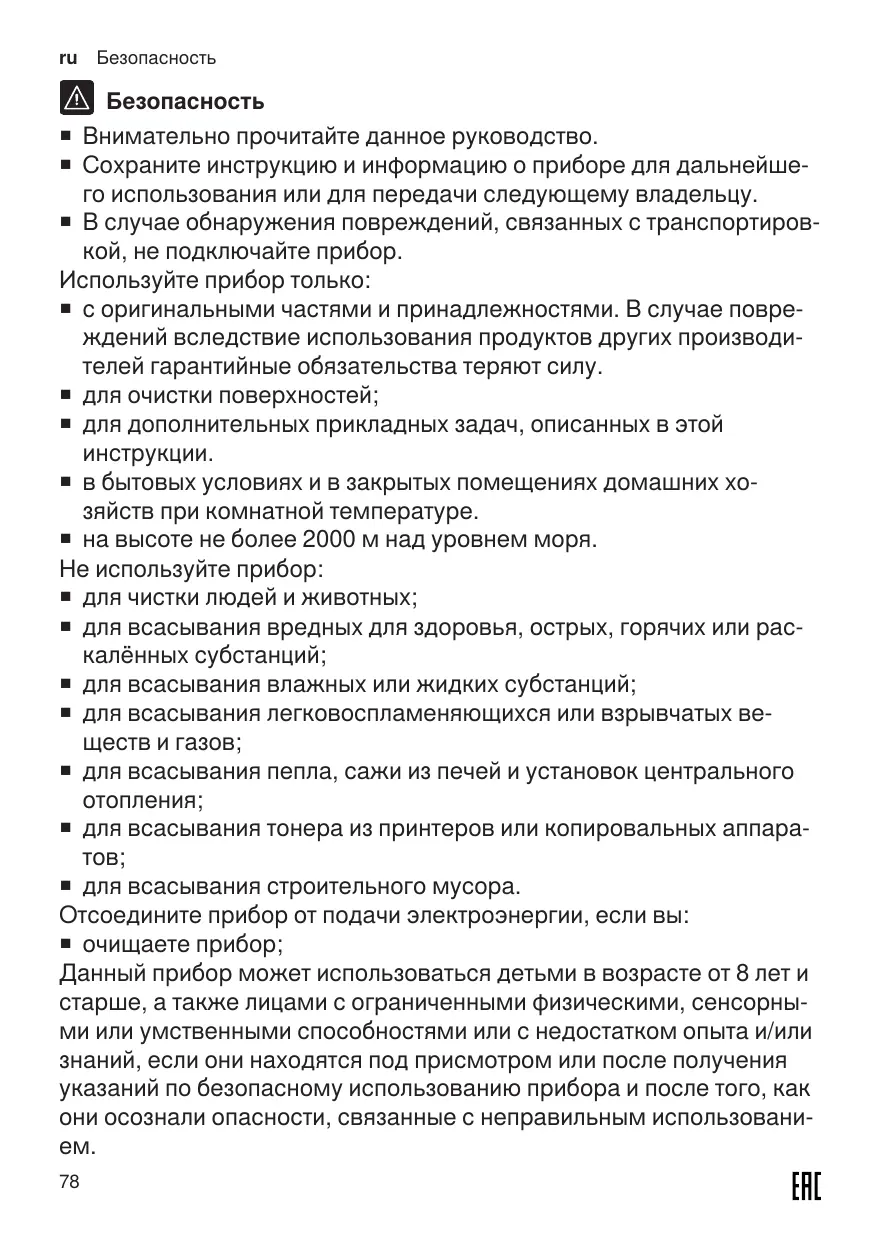 ¡ Read this instruction manual carefully. ¡ Keep the instruction manual and the product information safe for future reference or for the next owner. ¡ avec des pièces et accessoires d’origine. En cas de dommages dus à l’utilisation de produits tiers, le droit à la garantie expire. ¡ pour nettoyer les surfaces. ¡ pour les utilisations décrites dans cette notice. ¡ pour un usage domestique privé et dans les pièces fermées d’un domicile, à la température ambiante. ¡ jusqu'à une altitude maximale de 2000 m au-dessus du niveau de la mer. N’utilisez pas l’appareil : ¡ pour l’aspiration de personnes et d’animaux. ¡ pour l’aspiration de substances nocives pour la santé, aux arêtes vives, chaudes ou brûlantes. ¡ pour l’aspiration de substances humides ou liquides. ¡ pour l’aspiration de substances et gaz légèrement inflammables ou explosibles. ¡ pour l’aspiration de cendres, de la suie de four et d’installations de chauffage central. ¡ pour l’aspiration de poussières de toner des imprimantes et copieurs. ¡ pour l’aspiration de débris de construction. Débranchez l’appareil du secteur lorsque : ¡ vous nettoyez l’appareil. Les enfants de 8 ans et plus, les personnes souffrant d’un handicap physique, sensoriel ou mental ou ne détenant pas l’expérience et/ou les connaissances nécessaires pourront utiliser cet appareil à condition de le faire sous surveillance, ou que son utilisation sûre leur ait été enseignée et qu’ils aient compris les dangers qui en émanent. Les enfants ne sont pas autorisés à jouer avec l'appareil. 17