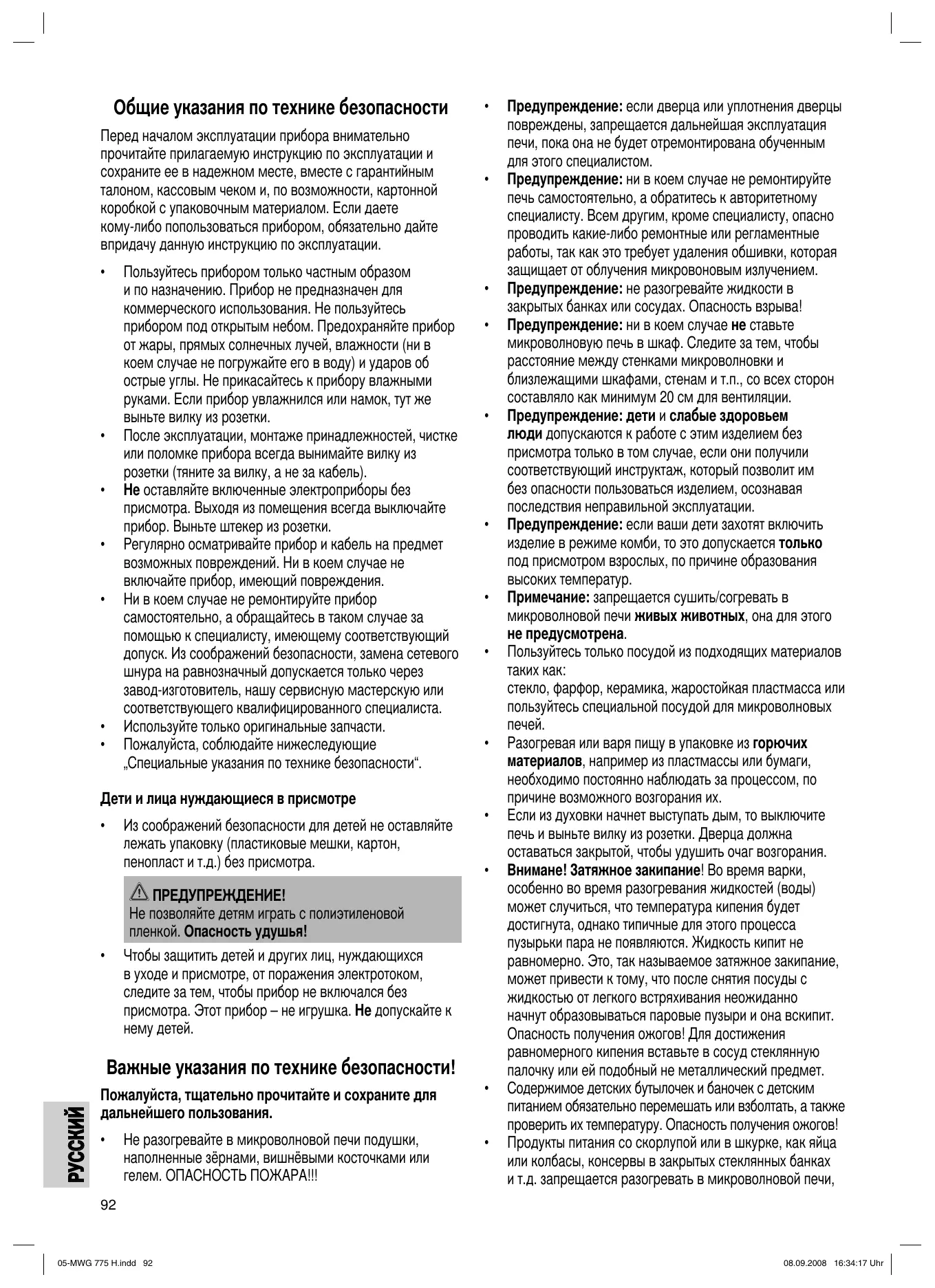 Предупреждение: если дверца или уплотнения дверцы повреждены, запрещается дальнейшая эксплуатация печи, пока она не будет отремонтирована обученным для этого специалистом. Предупреждение: ни в коем случае не ремонтируйте печь самостоятельно, а обратитесь к авторитетному специалисту. Всем другим, кроме специалисту, опасно проводить какие-либо ремонтные или регламентные работы, так как это требует удаления обшивки, которая защищает от облучения микровоновым излучением. Предупреждение: не разогревайте жидкости в закрытых банках или сосудах. Опасность взрыва! Предупреждение: ни в коем случае не ставьте микроволновую печь в шкаф. Следите за тем, чтобы расстояние между стенками микроволновки и близлежащими шкафами, стенам и т.п., со всех сторон составляло как минимум 20 см для вентиляции. Предупреждение: дети и слабые здоровьем люди допускаются к работе с этим изделием без присмотра только в том случае, если они получили соответствующий инструктаж, который позволит им без опасности пользоваться изделием, осознавая последствия неправильной эксплуатации. Предупреждение: если ваши дети захотят включить изделие в режиме комби, то это допускается только под присмотром взрослых, по причине образования высоких температур. Примечание: запрещается сушить/согревать в микроволновой печи живых животных, она для этого не предусмотрена. Пользуйтесь только посудой из подходящих материалов таких как: стекло, фарфор, керамика, жаростойкая пластмасса или пользуйтесь специальной посудой для микроволновых печей. Разогревая или варя пищу в упаковке из горючих материалов, например из пластмассы или бумаги, необходимо постоянно наблюдать за процессом, по причине возможного возгорания их. Если из духовки начнет выступать дым, то выключите печь и выньте вилку из розетки. Дверца должна оставаться закрытой, чтобы удушить очаг возгорания. Внимане! Затяжное закипание! Во время варки, особенно во время разогревания жидкостей (воды) может случиться, что температура кипения будет достигнута, однако типичные для этого процесса пузырьки пара не появляются. Жидкость кипит не равномерно. Это, так называемое затяжное закипание, может привести к тому, что после снятия посуды с жидкостью от легкого встряхивания неожиданно начнут образовываться паровые пузыри и она вскипит. Опасность получения ожогов! Для достижения равномерного кипения вставьте в сосуд стеклянную палочку или ей подобный не металлический предмет. Содержимое детских бутылочек и баночек с детским питанием обязательно перемешать или взболтать, а также проверить их температуру. Опасность получения ожогов! Продукты питания со скорлупой или в шкурке, как яйца или колбасы, консервы в закрытых стеклянных банках и т.д. запрещается разогревать в микроволновой печи,