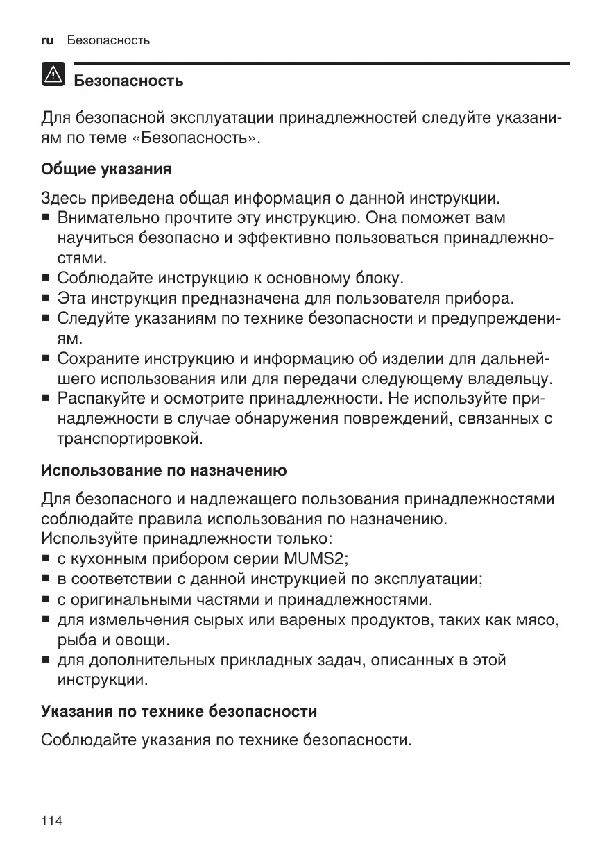 Fruchtpressenvorsatz verarbeiten1 Hinweis: Wenn Sie mit dem Fruchtpressenvorsatz arbeiten, beachten ¡ Observez la notice de l’appareil de base. ¡ Cette notice d’utilisation s’adresse à l'utilisateur de l’appareil. ¡ Respectez les consignes de sécurité et les avertissements. ¡ Conservez la notice ainsi que les informations produit en vue d’une réutilisation ultérieure ou pour un futur nouveau propriétaire. ¡ Contrôlez l’accessoire après l’avoir déballé. N’utilisez pas l’accessoire s’il a été endommagé durant le transport. Conformité d’utilisation Pour utiliser l’accessoire correctement et en toute sécurité, respectez les consignes d’utilisation conforme. Utilisez uniquement l’accessoire : ¡ avec un robot culinaire de la série MUMS2. ¡ en conformité avec la présente notice d’utilisation. ¡ avec des pièces et accessoires d’origine. ¡ pour broyer des aliments crus ou cuits, p. ex. de la viande, du poisson et des légumes. ¡ pour les autres utilisations décrites dans cette notice. Consignes de sécurité Respectez les consignes de sécurité.