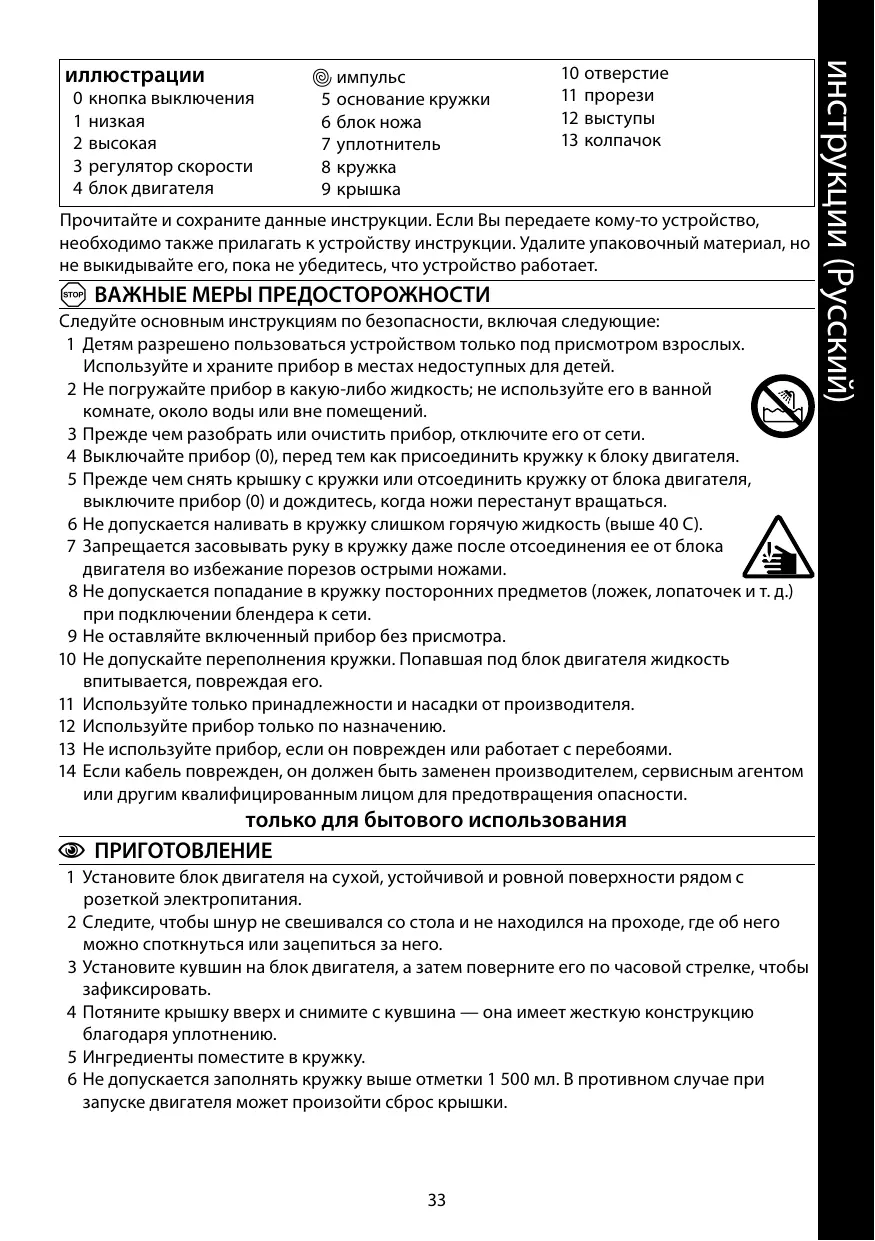 A ВАЖНЫЕ МЕРЫ ПРЕДОСТОРОЖНОСТИ Следуйте основным инструкциям по безопасности, включая следующие: 1 Детям разрешено пользоваться устройством только под присмотром взрослых. Используйте и храните прибор в местах недоступных для детей. 2 Не погружайте прибор в какую-либо жидкость; не используйте его в ванной комнате, около воды или вне помещений. 3 Прежде чем разобрать или очистить прибор, отключите его от сети. 4 Выключайте прибор (0), перед тем как присоединить кружку к блоку двигателя. 5 Прежде чем снять крышку с кружки или отсоединить кружку от блока двигателя, выключите прибор (0) и дождитесь, когда ножи перестанут вращаться. 6 Не допускается наливать в кружку слишком горячую жидкость (выше 40 C). 7 Запрещается засовывать руку в кружку даже после отсоединения ее от блока двигателя во избежание порезов острыми ножами. 8 Не допускается попадание в кружку посторонних предметов (ложек, лопаточек и т. д.) при подключении блендера к сети. 9 Не оставляйте включенный прибор без присмотра. 10 Не допускайте переполнения кружки. Попавшая под блок двигателя жидкость впитывается, повреждая его. 11 Используйте только принадлежности и насадки от производителя. 12 Используйте прибор только по назначению. 13 Не используйте прибор, если он поврежден или работает с перебоями. 14 Если кабель поврежден, он должен быть заменен производителем, сервисным агентом или другим квалифицированным лицом для предотвращения опасности.