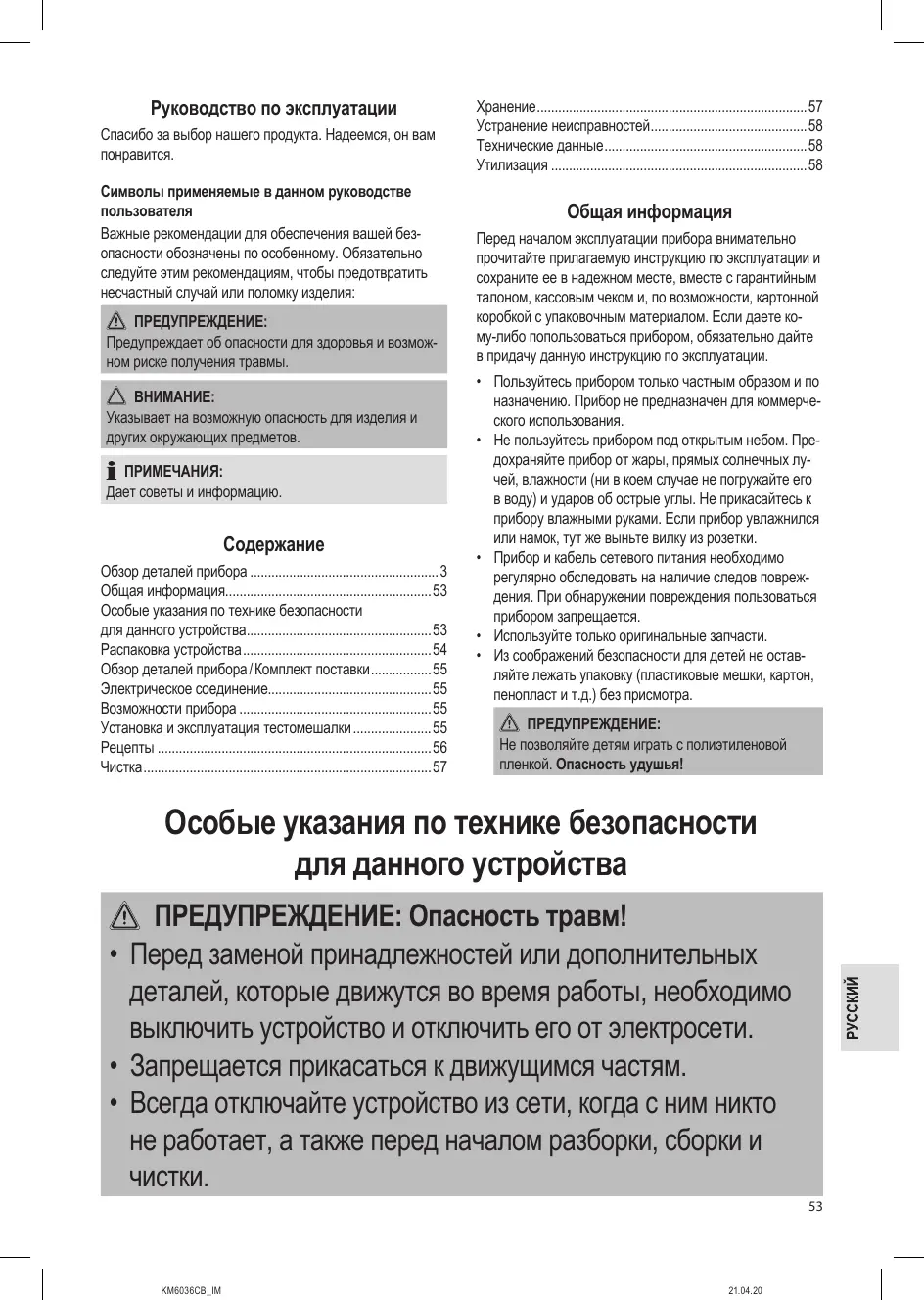 - Особые указания по технике безопасности для данного устройства p. 53