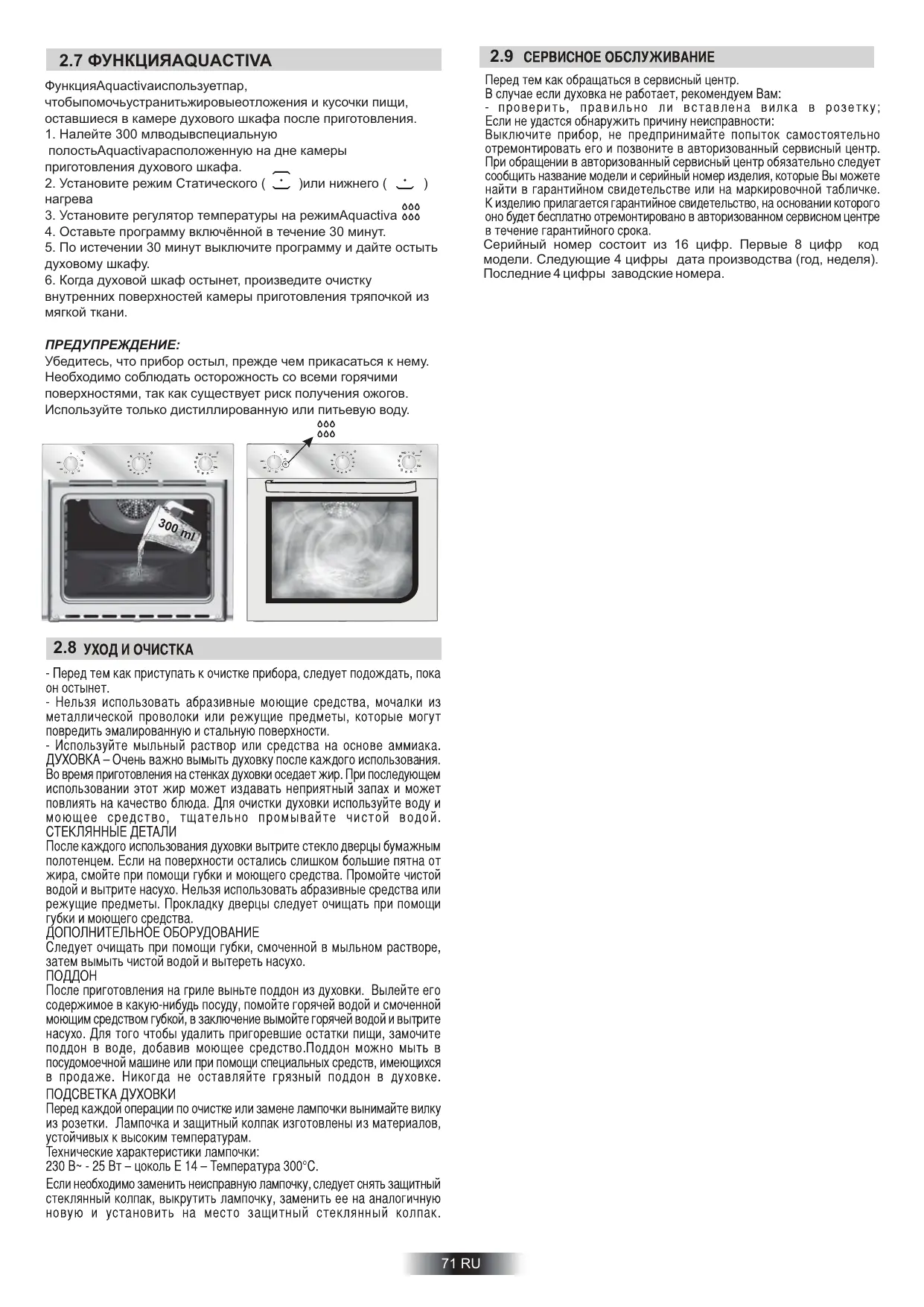 - Не покрывайте внутренние поверхности духовки алюминиевой фольгой и другими одноразовыми упаковочными материалами, которые продаются в хозяйственных магазинах. Алюминиевая фольга или другой у п а ко воч н ы й ма т е р и а л п р и ко н т а к т е с го ря ч е й эмалированной поверхностью духовки может расплавиться и повредить внутреннюю эмалированную поверхность I класс защиты от поражения током. 69 RU