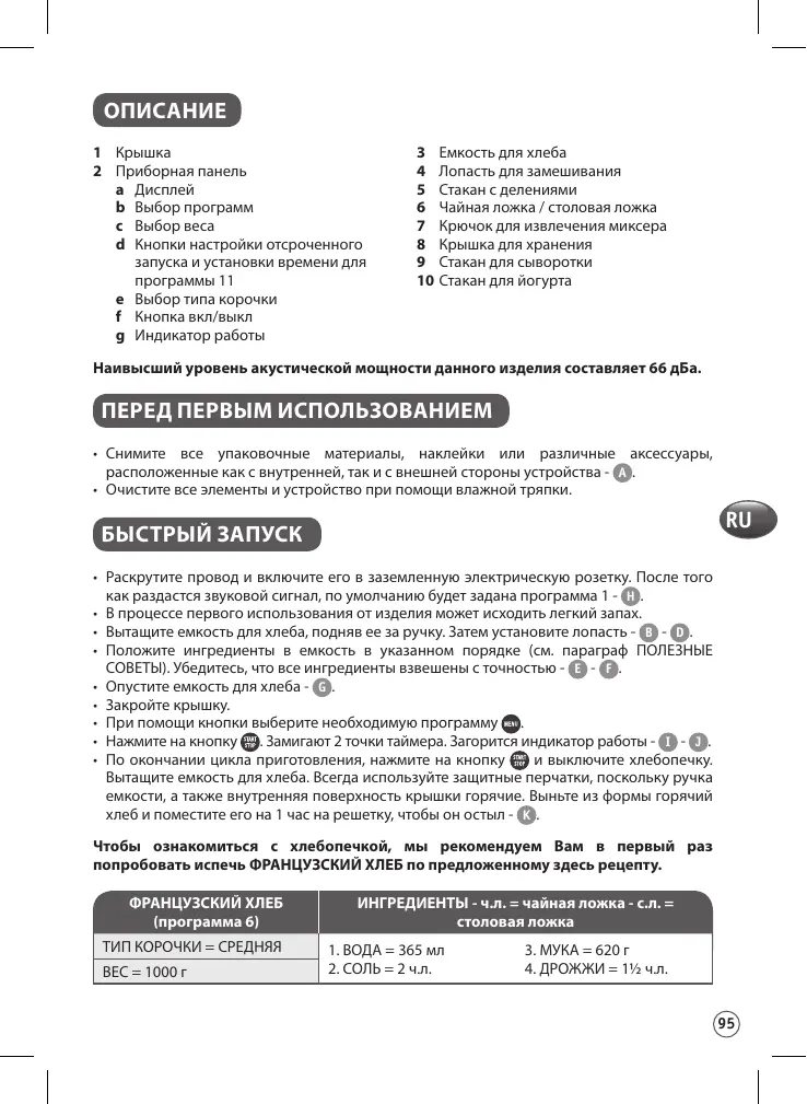 БЫСТРЫЙ ЗАПУСК • Раскрутите провод и включите его в заземленную электрическую розетку. После того как раздастся звуковой сигнал, по умолчанию будет задана программа 1 - H . • В процессе первого использования от изделия может исходить легкий запах. • Вытащите емкость для хлеба, подняв ее за ручку. Затем установите лопасть - B - D . • Положите ингредиенты в емкость в указанном порядке (см. параграф ПОЛЕЗНЫЕ СОВЕТЫ). Убедитесь, что все ингредиенты взвешены с точностью - E - F . • Опустите емкость для хлеба - G . • Закройте крышку. • При помощи кнопки выберите необходимую программу . • Нажмите на кнопку . Замигают 2 точки таймера. Загорится индикатор работы - I - J . • По окончании цикла приготовления, нажмите на кнопку и выключите хлебопечку. Вытащите емкость для хлеба. Всегда используйте защитные перчатки, поскольку ручка емкости, а также внутренняя поверхность крышки горячие. Выньте из формы горячий хлеб и поместите его на 1 час на решетку, чтобы он остыл - K . Чтобы ознакомиться с хлебопечкой, мы рекомендуем Вам в первый раз попробовать испечь ФРАНЦУЗСКИЙ ХЛЕБ по предложенному здесь рецепту. ФРАНЦУЗСКИЙ ХЛЕБ (программа 6) ТИП КОРОЧКИ = СРЕДНЯЯ ВЕС = 1000 г