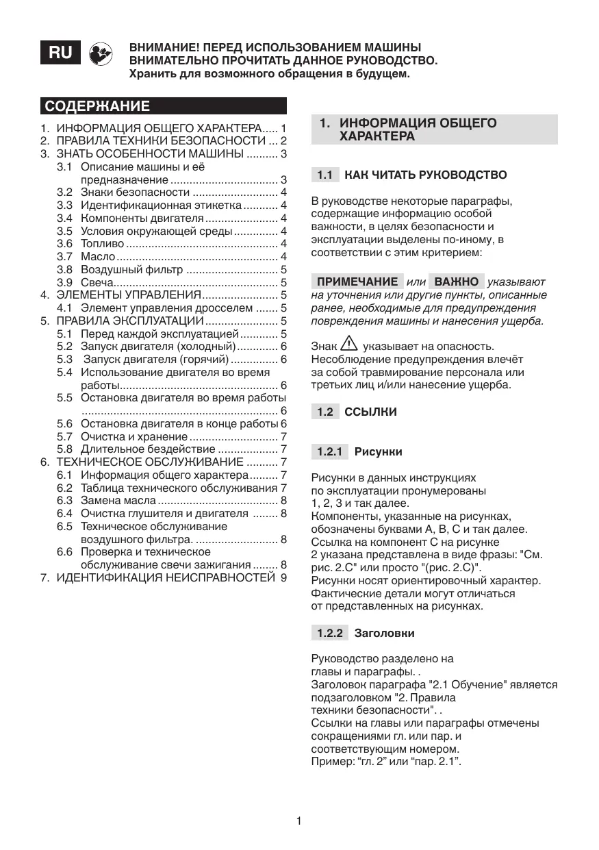 Внимательно прочитать данные инструкции перед эксплуатацией машины. Ознакомиться с элементами управления и с эксплуатационным назначением машины. Научиться быстро останавливать двигатель. Несоблюдение предупреждений и инструкций может стать причиной возгорания и/или нанесения тяжелых травм. Хранить все предупреждения и инструкции для возможного обращения в будущем.