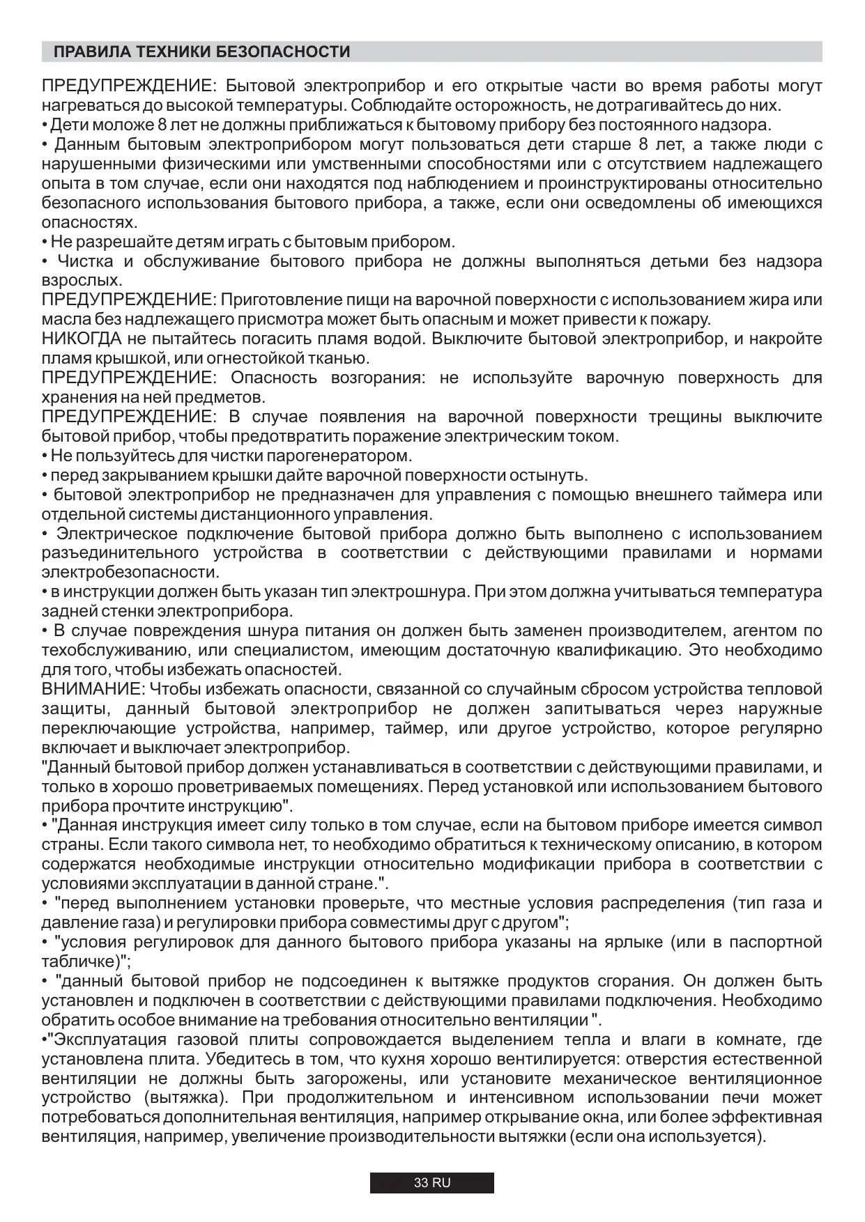 - "Эксплуатация газовой плиты сопровождается выделением тепла и влаги в комнате, где установлена плита. Убедитесь в том, что кухня хорошо вентилируется: отверстия естественной вентиляции не должны быть загорожены, или установите механическое вентиляционное устройство (вытяжка). При продолжительном и интенсивном использовании печи может потребоваться дополнительная вентиляция, например открывание окна, или более эффективная вентиляция, например, увеличение производительности вытяжки (если она используется). 33 RU