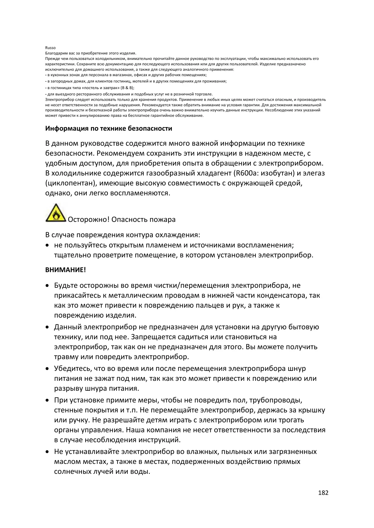 Russo Благодарим вас за приобретение этого изделия. Прежде чем пользоваться холодильником, внимательно прочитайте данное руководство по эксплуатации, чтобы максимально использовать его характеристики. Сохраните всю документацию для последующего использования или для других пользователей. Изделие предназначено исключительно для домашнего использования, а также для следующего аналогичного применения: - в кухонных зонах для персонала в магазинах, офисах и других рабочих помещениях; - в загородных домах, для клиентов гостиниц, мотелей и в других помещениях для проживания; - в гостиницах типа «постель и завтрак» (B & B); - для выездного ресторанного обслуживания и подобных услуг не в розничной торговле. Электроприбор следует использовать только для хранения продуктов. Применение в любых иных целях может считаться опасным, и производитель не несет ответственности за подобные нарушения. Рекомендуется также обратить внимание на условия гарантии. Для достижения максимальной производительности и безотказной работы электроприбора очень важно внимательно изучить данные инструкции. Несоблюдение этих указаний может привести к аннулированию права на бесплатное гарантийное обслуживание. Информация по технике безопасности В данном руководстве содержится много важной информации по технике безопасности. Рекомендуем сохранить эти инструкции в надежном месте, с удобным доступом, для приобретения опыта в обращении с электроприбором. В холодильнике содержится газообразный хладагент (R600a: изобутан) и элегаз (циклопентан), имеющие высокую совместимость с окружающей средой, однако, они легко воспламеняются. Осторожно! Опасность пожара В случае повреждения контура охлаждения: