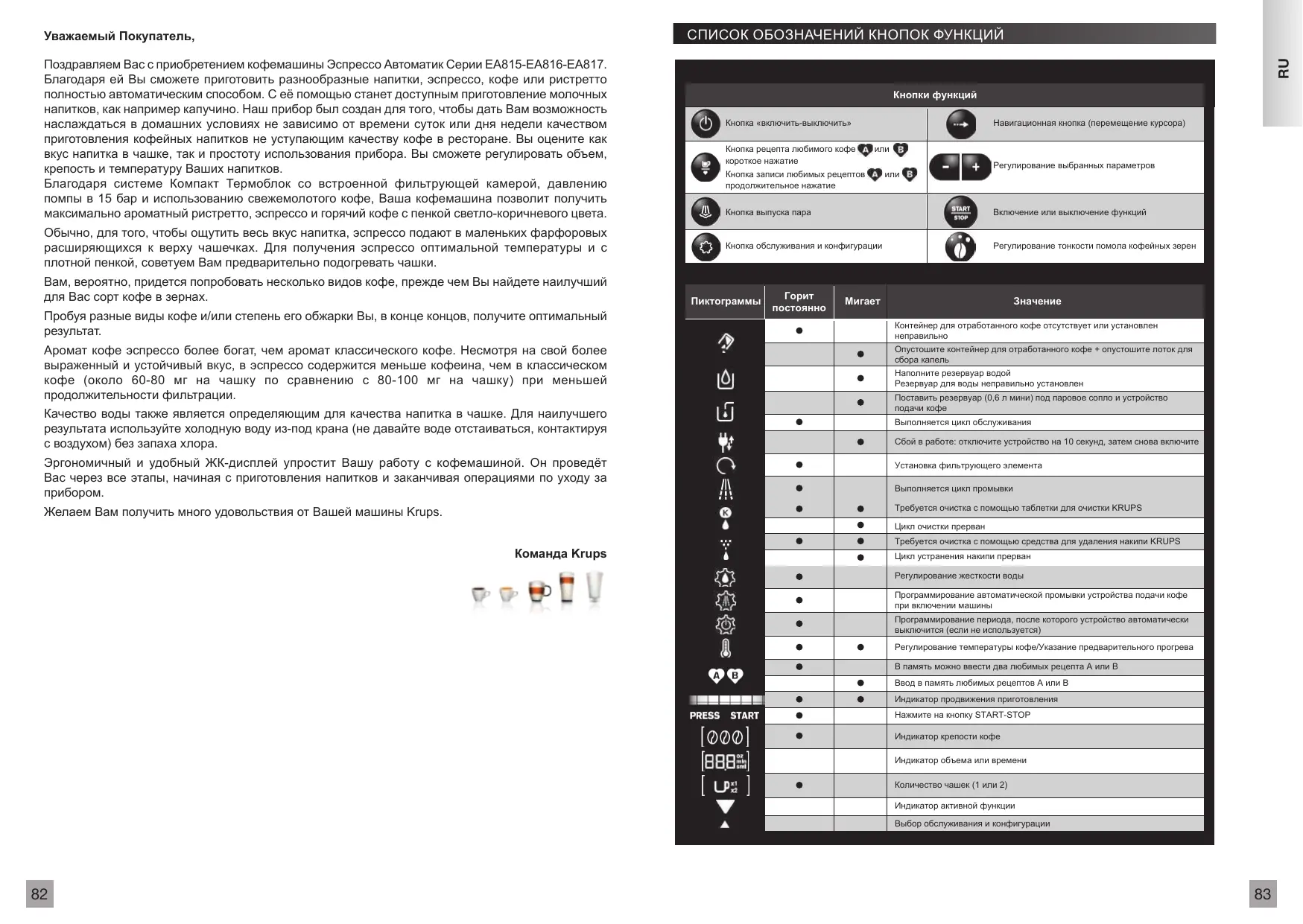 Установка фильтрующего элемента Выполняется цикл промывки Требуется очистка с помощью таблетки для очистки KRUPS Желаем Вам получить много удовольствия от Вашей машины Krups. Цикл очистки прерван Требуется очистка с помощью средства для удаления накипи KRUPS Команда Krups Цикл устранения накипи прерван Регулирование жесткости воды Программирование автоматической промывки устройства подачи кофе при включении машины Программирование периода, после которого устройство автоматически выключится (если не используется) Регулирование температуры кофе/Указание предварительного прогрева В память можно ввести два любимых рецепта A или B Ввод в память любимых рецептов A или B Индикатор продвижения приготовления Нажмите на кнопку START-STOP Индикатор крепости кофе Индикатор объема или времени Количество чашек (1 или 2) Индикатор активной функции Выбор обслуживания и конфигурации