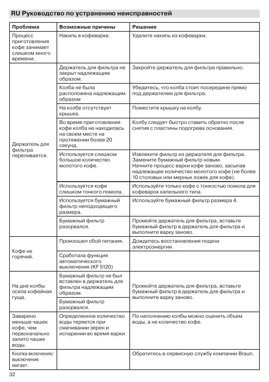 Сработала функция автоматического выключения (KF 5120) Бумажный фильтр не был вставлен в держатель для фильтра надлежащим Бумажный фильтр разорвался. Определенное количество воды теряется при смачивании зерен и испарении во время варки. Промойте держатель для фильтра, вставьте бумажный фильтр в держатель для фильтра и выполните варку заново. По наполнению колбы можно оценить объем воды, а не количество кофе. Обратитесь в сервисную службу компании Braun.