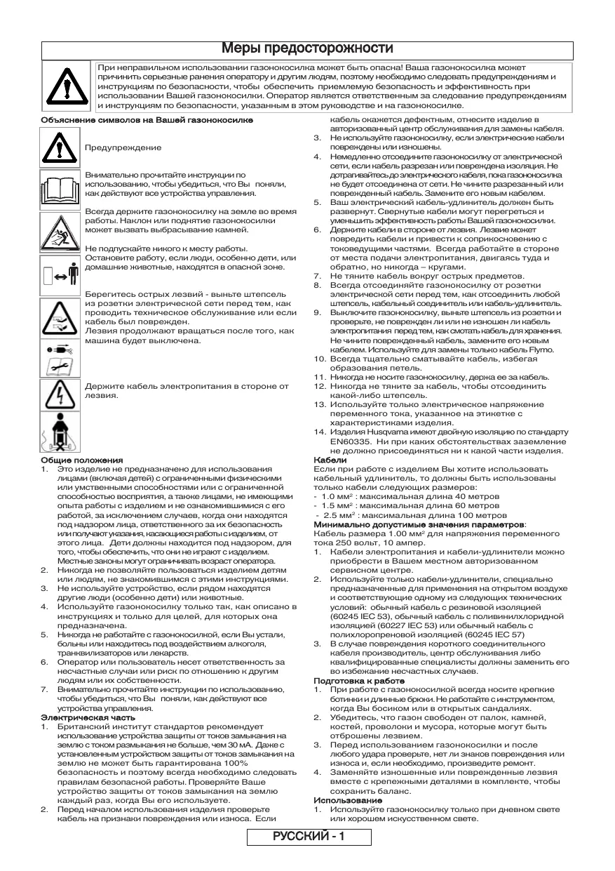 Меры предосторожности При неправильном использовании газонокосилка может быть опасна! Ваша газонокосилка может причинить серьезные ранения оператору и другим людям, поэтому необходимо следовать предупреждениям и инструкциям по безопасности, чтобы обеспечить приемлемую безопасность и эффективность при использовании Вашей газонокосилки. Оператор является ответственным за следование предупреждениям и инструкциям по безопасности, указанным в этом руководстве и на газонокосилке. Объяснение символов на Вашей газонокосилке Предупреждение Внимательно прочитайте инструкции по использованию, чтобы убедиться, что Вы поняли, как действуют все устройства управления. Всегда держите газонокосилку на земле во время работы. Наклон или поднятие газонокосилки может вызвать выбрасывание камней. Не подпускайте никого к месту работы. Остановите работу, если люди, особенно дети, или домашние животные, находятся в опасной зоне. Берегитесь острых лезвий - выньте штепсель из розетки электрической сети перед тем, как проводить техническое обслуживание или если кабель был поврежден. Лезвия продолжают вращаться после того, как машина будет выключена. Держите кабель электропитания в стороне от