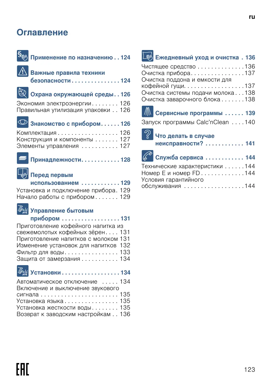 прибором . . . . . . . . . . . . . . . . . . 131 Приготовление кофейного напитка из свежемолотых кофейных зёрен . . . . 131 Приготовление напитков с молоком 131 Изменение установок для напитков 132 Фильтр для воды . . . . . . . . . . . . . . . . 133 Защита от замерзания . . . . . . . . . . . 134