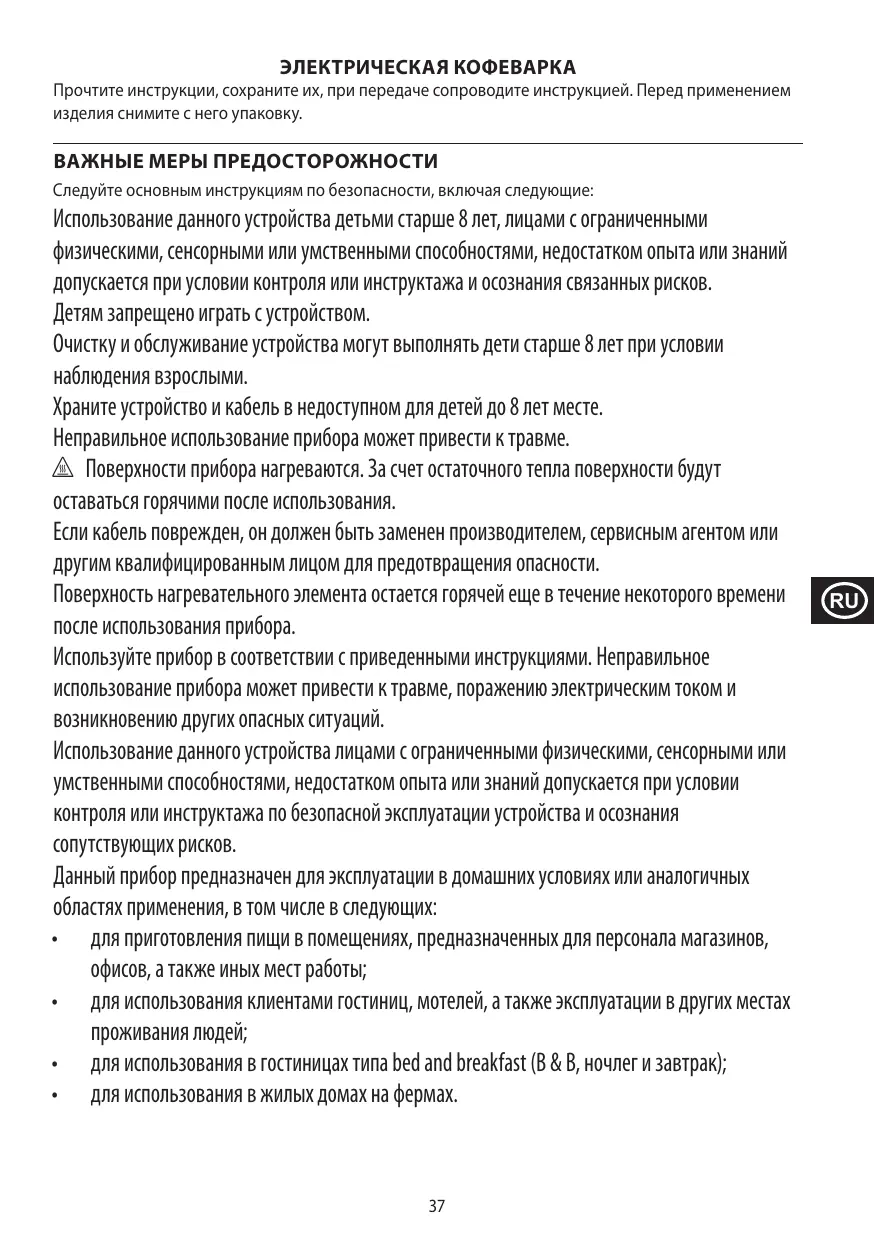 Использование данного устройства детьми старше 8 лет, лицами с ограниченными физическими, сенсорными или умственными способностями, недостатком опыта или знаний допускается при условии контроля или инструктажа и осознания связанных рисков. Детям запрещено играть с устройством. Очистку и обслуживание устройства могут выполнять дети старше 8 лет при условии наблюдения взрослыми. Храните устройство и кабель в недоступном для детей до 8 лет месте. Неправильное использование прибора может привести к травме. h Поверхности прибора нагреваются. За счет остаточного тепла поверхности будут оставаться горячими после использования. Если кабель поврежден, он должен быть заменен производителем, сервисным агентом или другим квалифицированным лицом для предотвращения опасности. Поверхность нагревательного элемента остается горячей еще в течение некоторого времени после использования прибора. Используйте прибор в соответствии с приведенными инструкциями. Неправильное использование прибора может привести к травме, поражению электрическим током и возникновению других опасных ситуаций. Использование данного устройства лицами с ограниченными физическими, сенсорными или умственными способностями, недостатком опыта или знаний допускается при условии контроля или инструктажа по безопасной эксплуатации устройства и осознания сопутствующих рисков. Данный прибор предназначен для эксплуатации в домашних условиях или аналогичных областях применения, в том числе в следующих: • для приготовления пищи в помещениях, предназначенных для персонала магазинов, офисов, а также иных мест работы; • для использования клиентами гостиниц, мотелей, а также эксплуатации в других местах проживания людей; • для использования в гостиницах типа bed and breakfast (B & B, ночлег и завтрак); • для использования в жилых домах на фермах.