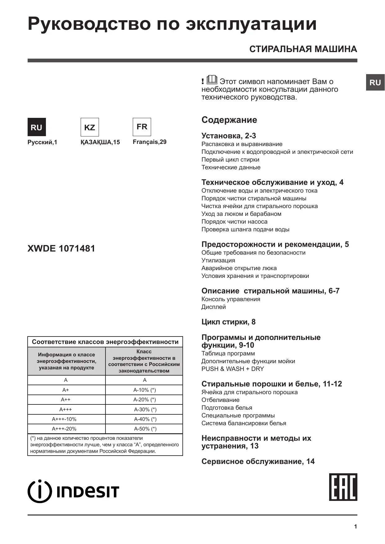 РУКОВОДСТВО ПОЛЬЗОВАТЕЛЯ XWDE 1071481XKKK INDESIT