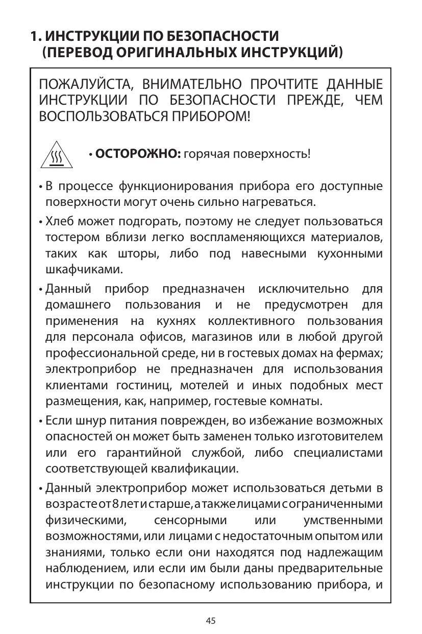 - Хлеб может подгорать, поэтому не следует пользоваться тостером вблизи легко воспламеняющихся материалов, таких как шторы, либо под навесными кухонными шкафчиками. Данный прибор предназначен исключительно для домашнего пользования и не предусмотрен для применения на кухнях коллективного пользования для персонала офисов, магазинов или в любой другой профессиональной среде, ни в гостевых домах на фермах; электроприбор не предназначен для использования клиентами гостиниц, мотелей и иных подобных мест размещения, как, например, гостевые комнаты.