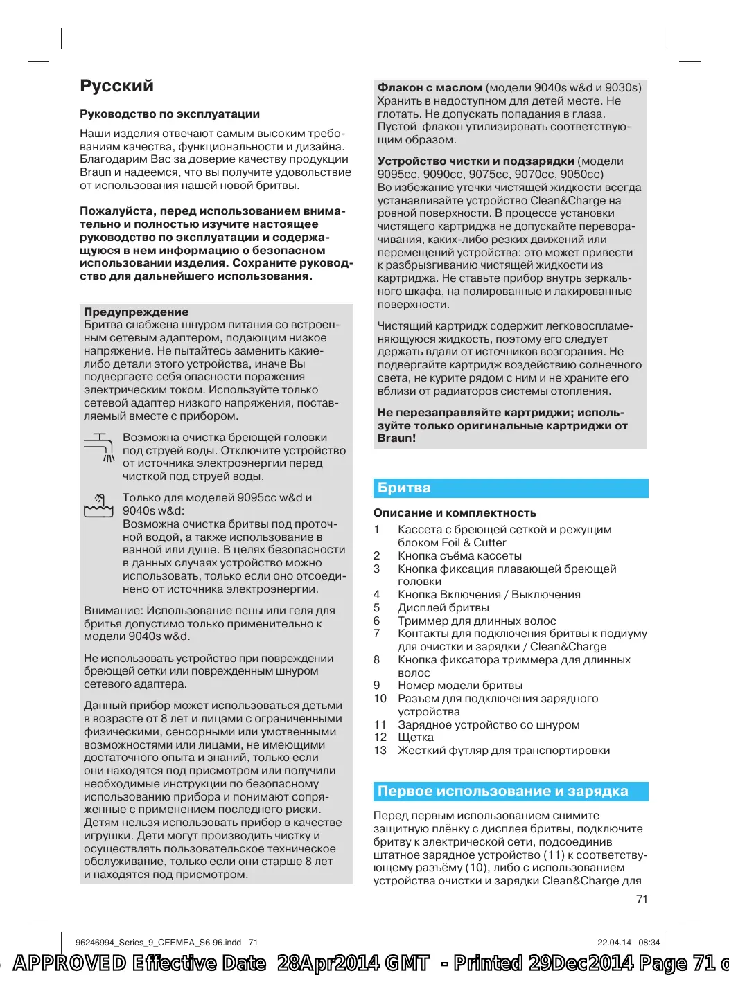 Флакон с маслом (модели 9040s w&d и 9030s) Хранить в недоступном для детей месте. Не глотать. Не допускать попадания в глаза. Пустой флакон утилизировать соответствующим образом. Устройство чистки и подзарядки (модели 9095сс, 9090сс, 9075сс, 9070сс, 9050сс) Во избежание утечки чистящей жидкости всегда устанавливайте устройство Clean&Charge на ровной поверхности. В процессе установки чистящего картриджа не допускайте переворачивания, каких-либо резких движений или перемещений устройства: это может привести к разбрызгиванию чистящей жидкости из картриджа. Не ставьте прибор внутрь зеркального шкафа, на полированные и лакированные поверхности. Чистящий картридж содержит легковоспламеняющуюся жидкость, поэтому его следует держать вдали от источников возгорания. Не подвергайте картридж воздействию солнечного света, не курите рядом с ним и не храните его вблизи от радиаторов системы отопления. Не перезаправляйте картриджи; используйте только оригинальные картриджи от Braun!