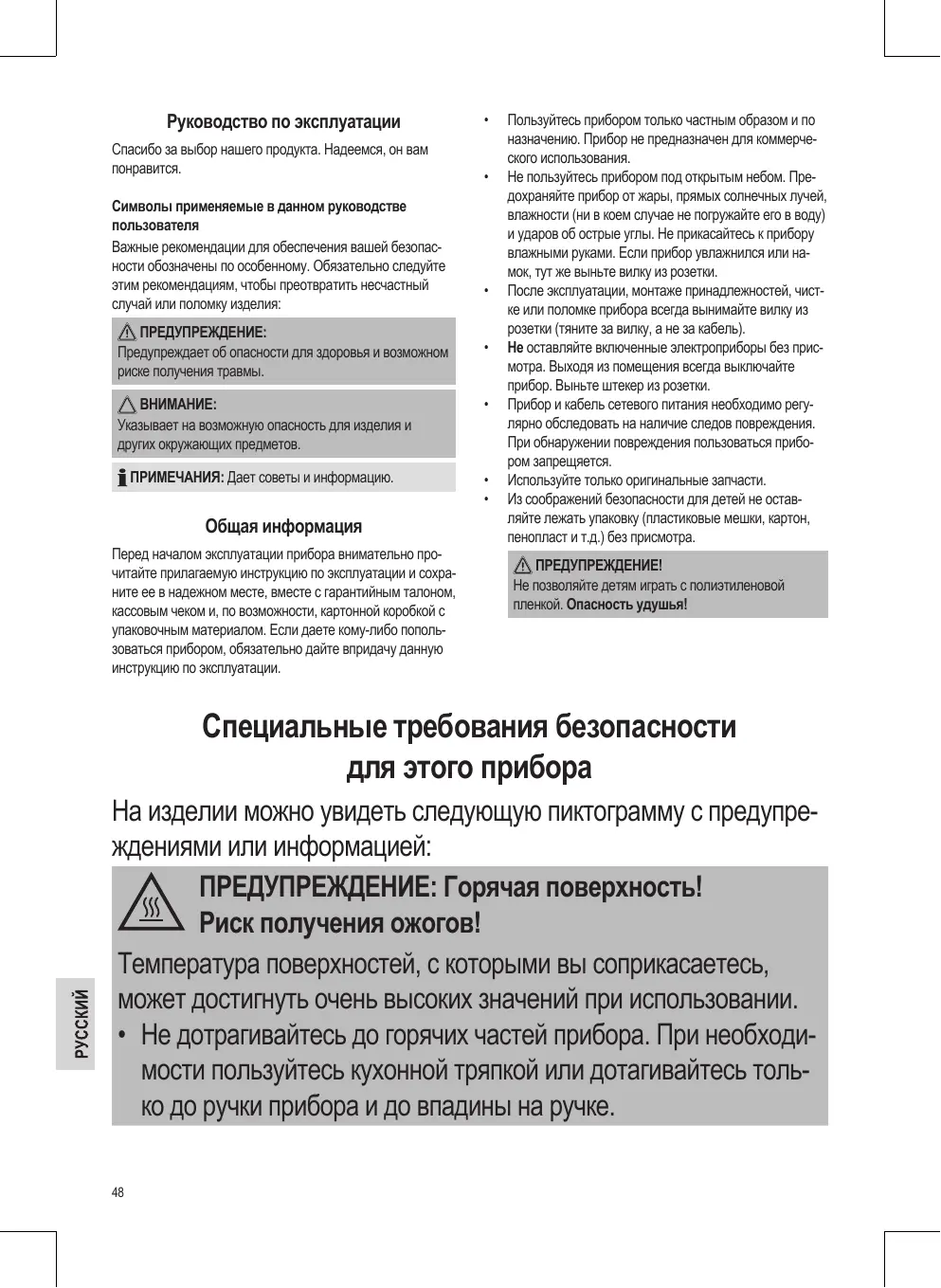 Специальные требования безопасности для этого прибора Нa издeлии можнo yвидeть cлeдyющyю пиктoгpaммy c пpeдyпpeждeниями или инфopмaциeй: ПРЕДУПРЕЖДЕНИЕ: Горячая поверхность! Риск получения ожогов! Температура поверхностей, с которыми вы соприкасаетесь, может достигнуть очень высоких значений при использовании. • Не дотрагивайтесь до горячих частей прибора. При необходимости пользуйтесь кухонной тряпкой или дотагивайтесь только до ручки прибора и до впадины на ручке. 48