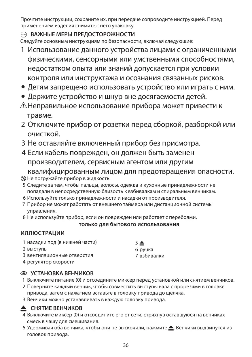1 Использование данного устройства лицами с ограниченными физическими, сенсорными или умственными способностями, недостатком опыта или знаний допускается при условии контроля или инструктажа и осознания связанных рисков. • Детям запрещено использовать устройство или играть с ним. • Держите устройство и шнур вне досягаемости детей. c Неправильное использование прибора может привести к травме. 2 Отключите прибор от розетки перед сборкой, разборкой или очисткой. 3 Не оставляйте включенный прибор без присмотра. 4 Если кабель поврежден, он должен быть заменен производителем, сервисным агентом или другим квалифицированным лицом для предотвращения опасности. L Не погружайте прибор в жидкость. 5 Следите за тем, чтобы пальцы, волосы, одежда и кухонные принадлежности не попадали в непосредственную близость к взбивалкам и спиральным венчикам. 6 Используйте только принадлежности и насадки от производителя. 7 Прибор не может работать от внешнего таймера или дистанционной системы управления. 8 Не используйте прибор, если он поврежден или работает с перебоями.