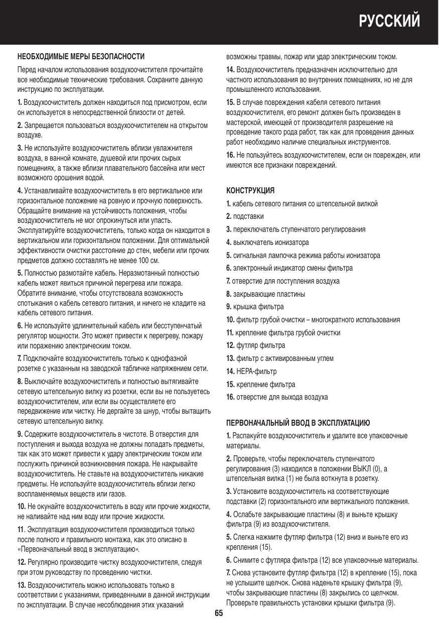 10. Ne plongez l'épurateur d'air ni dans l'eau ni dans d'autres liquides et ne versez pas d'eau ni d'autres liquides sur l'appareil.