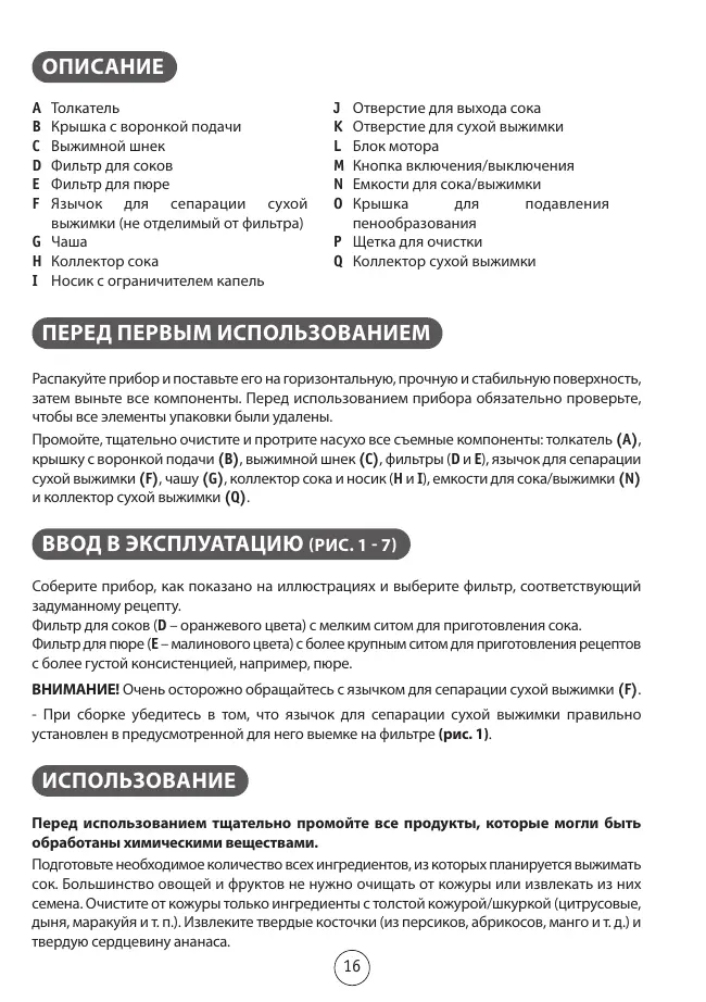 ПЕРЕД ПЕРВЫМ ИСПОлЬЗОВАНИЕМ Распакуйте прибор и поставьте его на горизонтальную, прочную и стабильную поверхность, затем выньте все компоненты. Перед использованием прибора обязательно проверьте, чтобы все элементы упаковки были удалены. Промойте, тщательно очистите и протрите насухо все съемные компоненты: толкатель (A), крышку с воронкой подачи (B), выжимной шнек (C), фильтры (D и E), язычок для сепарации сухой выжимки (F), чашу (G), коллектор сока и носик (H и I), емкости для сока/выжимки (N) и коллектор сухой выжимки (Q).