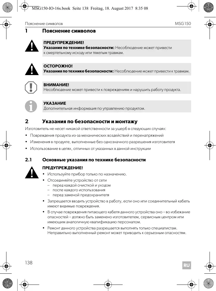 MSG150 Прочтите данную инструкцию перед монтажом и вводом в эксплуатацию и сохраните ее. В случае передачи продукта передайте инструкцию следующему пользователю.