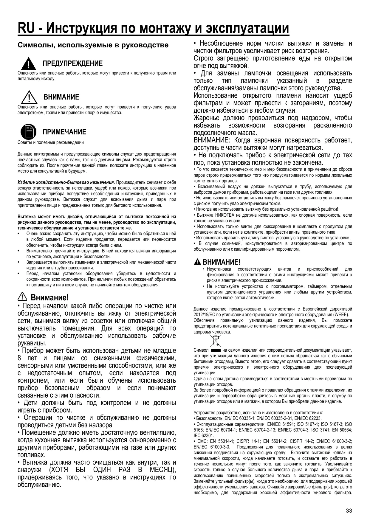 • Les enfants ne doivent pas jouer avec l’appareil. • Le nettoyage et l’entretien par l’usager ne doivent pas être effectués par des enfants sans surveillance. • La pièce doit avoir une aération suffisante lorsque la hotte est utilisée conjointement avec d'autres appareils fonctionnant au gaz ou autres combustibles. • La hotte doit être régulièrement nettoyée à la fois à l'intérieur et à l'extérieur (AU MOINS UNE FOIS PAR MOIS); cela devrait se faire en conformité avec les instructions d'entretien. Le non respect des instructions