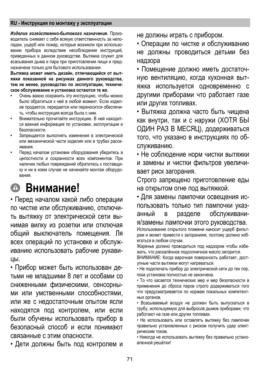 RU - Инструкция по монтажу у эксплуатации Изделие хозяйственно-бытового назначения. Производитель снимает с себя всякую ответственность за неполадки, ущерб или пожар, которые возникли при использовании прибора вследствие несоблюдения инструкций, приведенных в данном руководстве. Вытяжка служит для всасывания дыма и пара при приготовлении пищи и предназначена только для бытового использования. Вытяжка может иметь дизайн, отличающийся от вытяжки показанной на рисунках данного руководства, тем не менее, руководство по эксплуатации, техническое обслуживание и установка остаются те же.