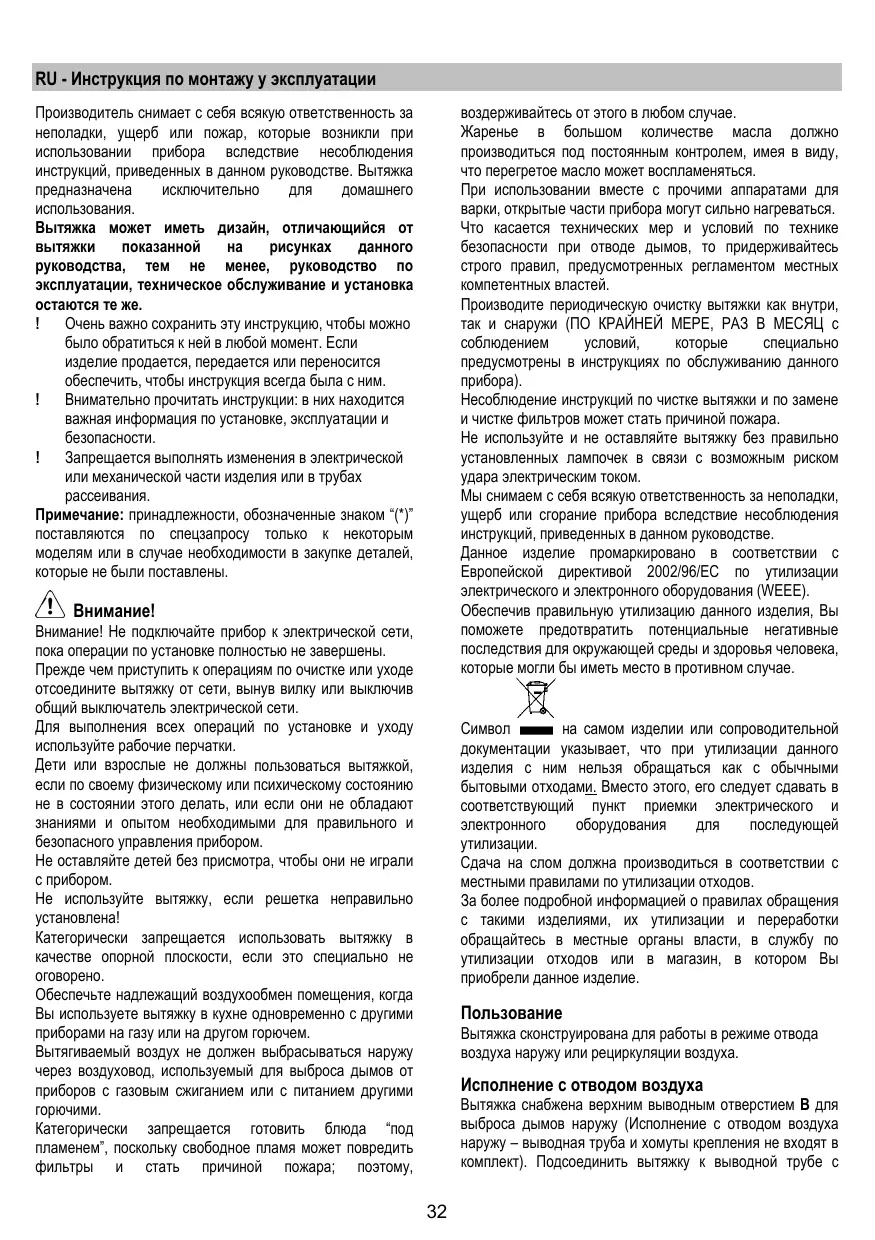Attention! Ne pas raccorder l’appareil au circuit électrique avant que le montage ne soit complètement terminé. Avant toute opération de nettoyage ou d’entretien, débrancher la hotte du circuit électrique en retirant la prise ou en coupant l’interrupteur général de l’habitation. Munissez-vous de gants de travail avant d’effectuer toute opération d’installation et d’entretien. L’appareil n’est pas destiné à une utilisation par des enfants ou des personnes à capacités physiques, sensorielles ou mentales réduites et sans expérience et connaissance à moins qu’ils ne soient sous la supervision ou formés sur l’utilisation de l’appareil par une personne responsable de leur sécurité. Les enfants doivent être surveillés afin qu’ils ne jouent pas avec l’appareil. Ne jamais utiliser la hotte sans que la grille ne soit montée correctement! La hotte ne doit JAMAIS être utilisée comme plan pour déposer quelque chose sauf si cela est expressément indiqué. Quand la hotte est utilisée en même temps que d’autres appareils à combustion de gaz ou d’autres combustibles, le local doit disposer d’une ventilation suffisante. L’air aspiré ne doit jamais être envoyé dans un conduit utilisé pour l’évacuation des fumées produites par des appareils à combustion de gaz ou d’autres combustibles. Il est formellement interdit de faire flamber les aliments sous la hotte. L’utilisation de flammes libres peut entraîner des dégâts aux filtres et peut donner lieu à des incendies, il faut donc les éviter à tout prix. La friture d’aliments doit être réalisée sous contrôle pour éviter