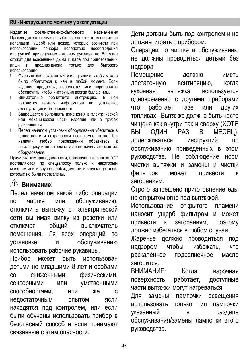 Внимание! Перед началом какой либо операции по чистке или обслуживанию, отключить вытяжку от электрической сети вынимая вилку из розетки или отключая общий выключатель помещения. Ля всех операций по установке и обслуживанию использовать рабочие рукавицы. Прибор может быть использован детьми не младшими 8 лет и особами со сниженными физическими, сенсорными или умственными способностями, или же с недостаточным опытом ясли находятся под контролем, или если были обучены использовать прибор в безопасный способ и если понимают связанные с этим опасности. 45