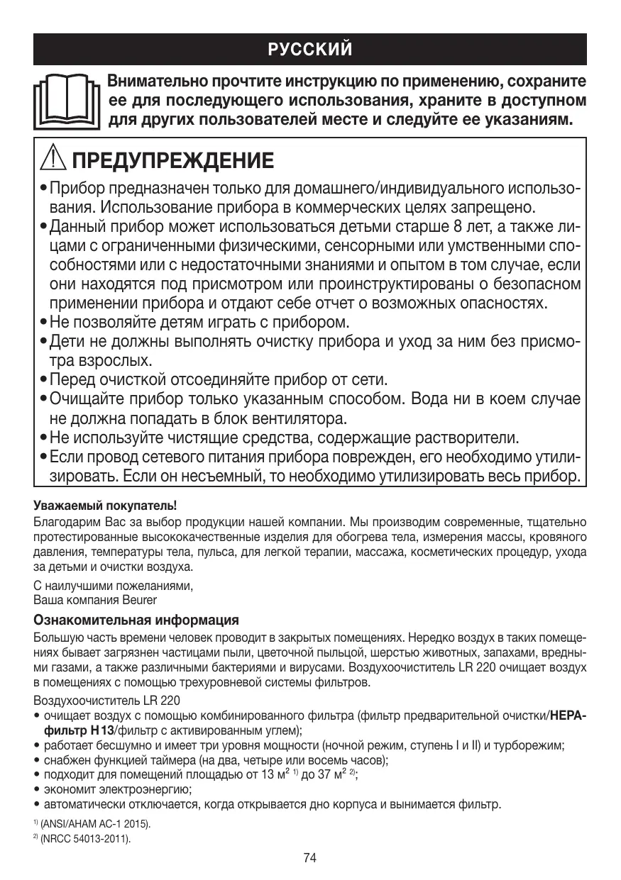 - Если провод сетевого питания прибора поврежден, его необходимо утилизировать. Если он несъемный, то необходимо утилизировать весь прибор. Уважаемый покупатель! Благодарим Вас за выбор продукции нашей компании. Мы производим современные, тщательно протестированные высококачественные изделия для обогрева тела, измерения массы, кровяного давления, температуры тела, пульса, для легкой терапии, массажа, косметических процедур, ухода за детьми и очистки воздуха. С наилучшими пожеланиями, Ваша компания Beurer Ознакомительная информация Большую часть времени человек проводит в закрытых помещениях. Нередко воздух в таких помещениях бывает загрязнен частицами пыли, цветочной пыльцой, шерстью животных, запахами, вредными газами, а также различными бактериями и вирусами. Воздухоочиститель LR 220 очищает воздух в помещениях с помощью трехуровневой системы фильтров. Воздухоочиститель LR 220