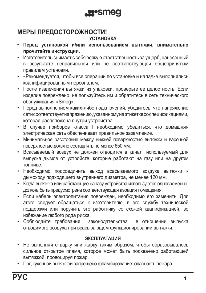 Lorsque la hotte est enlevée de l'emballage, en vérifier son état. Si le produit est endommagé, ne pas l'utiliser et contacter le réseau d'assistance Smeg. Avant d'effectuer tout raccordement, s'assurer que la tension de réseau corresponde à la tension indiquée sur l'étiquette caractéristique située à l'intérieur de l'appareil. Pour les appareils de Classe I, vérifier que l'installation électrique domestique garantisse un déchargement à la terre correct. La distance minimum entre la plaque de cuisson et la partie inférieure de la hotte doit être d'au moins 650 mm. L’air aspiré ne doit pas être convoyé dans un conduit utilisé pour l’évacuation des fumées des appareils alimentés au gaz ou avec d’autres combustibles. Raccorder la sortie de l'air aspiré par la hotte aux conduits d'évacuation des fumées d'un diamètre interne adéquat et non inférieur à 120 mm. Prévoir toujours une aération adéquate du local lorsque la hotte ou les appareils à gaz sont utilisés en même temps. Si le câble d'alimentation est endommagé, il doit être remplacé par le fabricant ou par son service d'assistance technique ou de toute façon par une personne ayant une qualification similaire afin de prévenir tout risque. Respecter les prescriptions de lois concernant l'expulsion de l'air à évacuer dans le fonctionnement aspirant de la hotte.