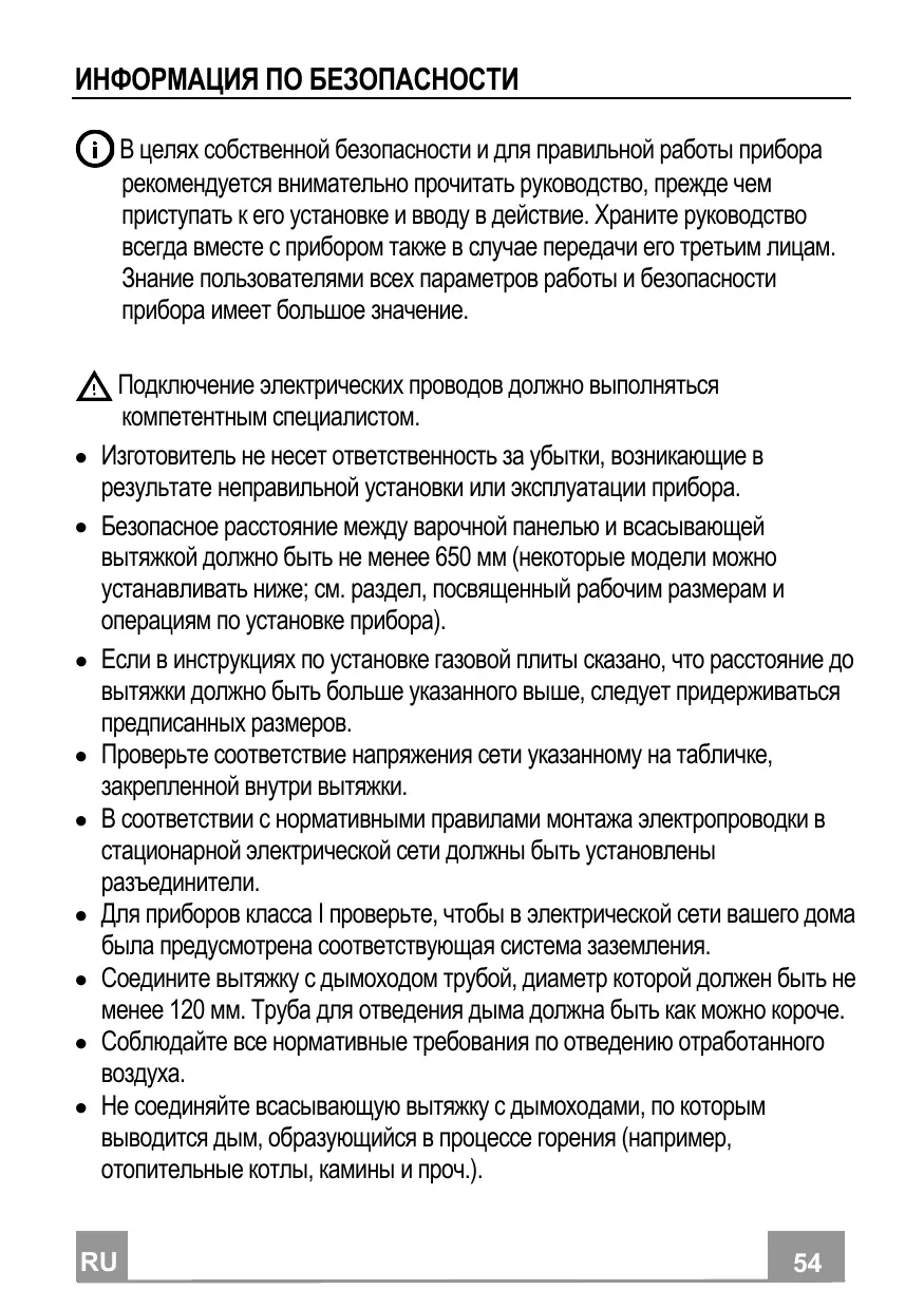 CONSIGNES DE SÉCURITÉ Pour votre sécurité et pour garantir le fonctionnement correct de l’appareil, veuillez lire attentivement ce manuel avant d’installer et de mettre en fonction l’appareil. Toujours conserver ces instructions avec l’appareil, même en cas de cession ou de transfert à une autre personne. Il est important que les utilisateurs connaissent toutes les caractéristiques de fonctionnement et de sécurité de l’appareil. La connexion des câbles doit être effectuée par un technicien compétent. En aucun cas le fabricant ne peut être tenu pour responsable d’éventuels dommages dus à une installation ou à une utilisation impropre. La distance de sécurité minimum entre le plan de cuisson et la hotte aspirante est de 650 mm (certains modèles peuvent être installés à une hauteur inférieure ; voir le paragraphe concernant les dimensions de travail et l’installation). Si les instructions d’installation du plan de cuisson à gaz spécifient une distance supérieure à celle indiquée ci-dessus, veuillez impérativement en tenir compte. Assurez-vous que la tension du secteur correspond à celle indiquée sur la plaque des caractéristiques apposée à l’intérieur de la hotte. Les dispositifs de sectionnement doivent être montés dans l’installation fixe conformément aux normes sur les systèmes de câblage. Pour les appareils de Classe I, s’assurer que l’installation électrique de votre intérieur dispose d’une mise à la terre adéquate. Reliez l’aspirateur du conduit de cheminée avec un tube ayant un diamètre minimum de 120 mm. Le parcours des fumées doit être le plus court possible. Respecter toutes les normes concernant l’évacuation de l’air. Ne reliez pas la hotte aspirante aux conduits de cheminée qui acheminent les fumées de combustion (par ex. de chaudières, de cheminées, etc.).