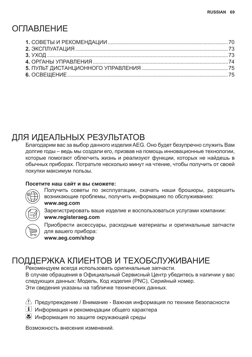 6. ОСВЕЩЕНИЕ........................................................................................................................75 ДЛЯ ИДЕАЛЬНЫХ РЕЗУЛЬТАТОВ Благодарим вас за выбор данного изделия AEG. Оно будет безупречно служить Вам долгие годы – ведь мы создали его, призвав на помощь инновационные технологии, которые помогают облегчить жизнь и реализуют функции, которых не найдешь в обычных приборах. Потратьте несколько минут на чтение, чтобы получить от своей покупки максимум пользы. Посетите наш сайт и вы сможете: Получить советы по эксплуатации, скачать наши брошюры, разрешить возникающие проблемы, получить информацию по обслуживанию: www.aeg.com Зарегистрировать ваше изделие и воспользоваться услугами компании: www.registeraeg.com Приобрести аксессуары, расходные материалы и оригинальные запчасти для вашего прибора: www.aeg.com/shop ПОДДЕРЖКА КЛИЕНТОВ И ТЕХОБСЛУЖИВАНИЕ Рекомендуем всегда использовать оригинальные запчасти. В случае обращения в Официальный Сервисный Центр убедитесь в наличии у вас следующих данных: Модель, Код изделия (PNC), Серийный номер. Эти сведения указаны на табличке технических данных. Предупреждение / Внимание - Важная информация по технике безопасности Информация и рекомендации общего характера Информация по защите окружающей среды Возможность внесения изменений. 70 www.aeg.com
