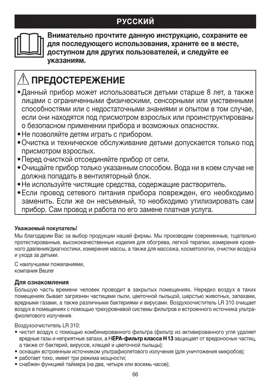 • Данный прибор может использоваться детьми старше 8 лет, а также лицами с ограниченными физическими, сенсорными или умственными способностями или с недостаточными знаниями и опытом в том случае, если они находятся под присмотром взрослых или проинструктированы о безопасном применении прибора и возможных опасностях. • Не позволяйте детям играть с прибором. • Очистка и техническое обслуживание детьми допускается только под присмотром взрослых. • Перед очисткой отсоединяйте прибор от сети. • Очищайте прибор только указанным способом. Вода ни в коем случае не должна попадать в вентиляторный блок. • Не используйте чистящие средства, содержащие растворитель. • Если провод сетевого питания прибора поврежден, его необходимо заменить. Если же он несъемный, то необходимо утилизировать сам прибор. Сам провод и работа по его замене платная услуга. Уважаемый покупатель! Мы благодарим Вас за выбор продукции нашей фирмы. Мы производим современные, тщательно протестированные, высококачественные изделия для обогрева, легкой терапии, измерения кровяного давления/диагностики, измерения массы, а также для массажа, косметологии, очистки воздуха и ухода за детьми. С наилучшими пожеланиями, компания Beurer