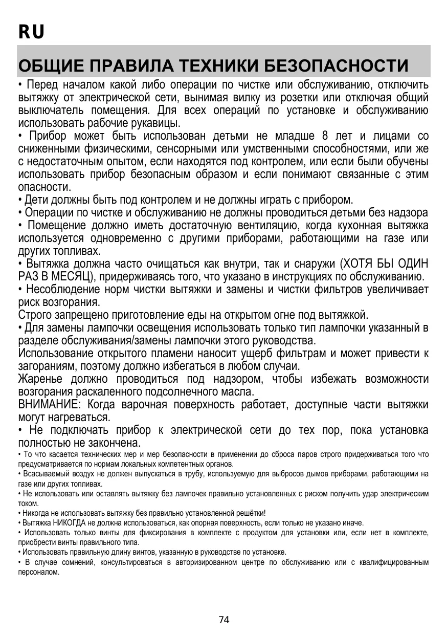 • Les enfants ne doivent pas jouer avec l’appareil. • Le nettoyage et l’entretien par l’usager ne doivent pas être effectués par des enfants sans surveillance. • La pièce doit avoir une aération suffisante lorsque la hotte est utilisée conjointement avec d'autres appareils fonctionnant au gaz ou autres combustibles. • La hotte doit être régulièrement nettoyée à la fois à l'intérieur et à l'extérieur (AU MOINS UNE FOIS PAR MOIS); cela devrait se faire en conformité avec les instructions d'entretien. Le non respect des instructions expressément fournies concernant le nettoyage de la hotte et des filtres peut provoquer des risques d'incendie. • Ne pas flamber d’aliments sous la hotte. • Pour le remplacement de la lampe, utilisez uniquement le type de lampe spécifié dans la section remplacement/maintenance lampe dans ce manuel. L'utilisation d'une flamme nue est dommageable pour les filtres et peut causer un incendie, par conséquent, il est déconseillé de l'utiliser. La friture doit être faite avec soin afin de s’assurer que l’huile surchauffée ne prenne pas feu. AVERTISSEMENT: Lorsque la table de cuisson est en fonctionnement, les parties accessibles de la hotte peuvent devenir très chaudes. • Ne pas brancher l'appareil au réseau électrique avant que l'installation ne soit complètement terminée. • En ce qui concerne les mesures techniques et de sécurité à prendre pour l'évacuation des fumées, respectez strictement les dispositions des règlements locales. • L’air ne doit pas être envoyé dans un conduit utilisé pour évacuer les fumées d’appareils utilisant du gaz ou un autre combustible. • Ne pas utiliser ou laisser la hotte sans les lampes correctement montées, car un éventuel risque de choc électrique est possible. • N’utilisez jamais la hotte sans la grille montée correctement! • La hotte ne doit JAMAIS être utilisée comme une surface d'appui, sauf indication expresse. • Utilisez uniquement les vis de fixation fournies avec le produit pour l'installation, ou, si non fournies, acheter le type correct de vis. • Utilisez la longueur correcte pour les vis qui sont identifiées dans le Guide d'installation. • En cas de doute, consultez votre centre de service agréé ou du personnel qualifié.