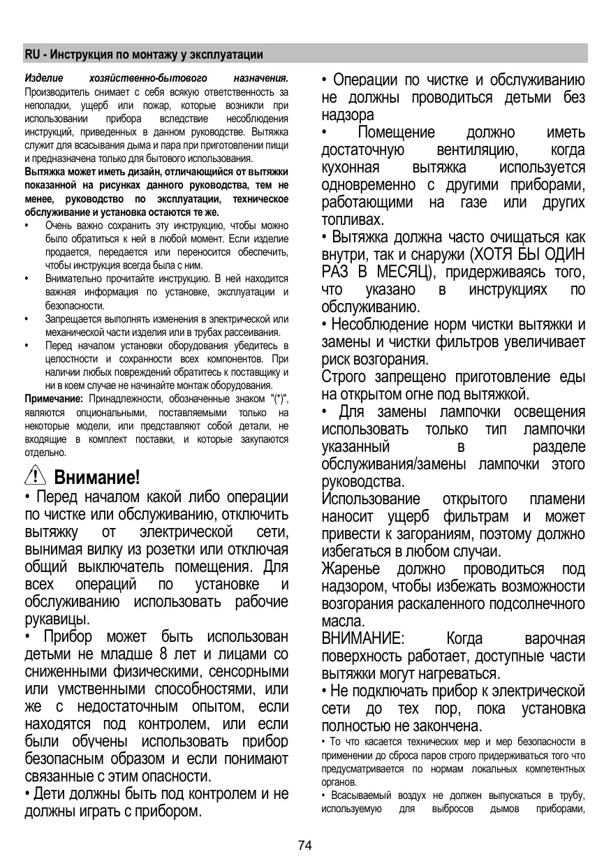 • Перед началом какой либо операции по чистке или обслуживанию, отключить вытяжку от электрической сети, вынимая вилку из розетки или отключая общий выключатель помещения. Для всех операций по установке и обслуживанию использовать рабочие рукавицы. • Прибор может быть использован детьми не младше 8 лет и лицами со сниженными физическими, сенсорными или умственными способностями, или же с недостаточным опытом, если находятся под контролем, или если были обучены использовать прибор безопасным образом и если понимают связанные с этим опасности. • Дети должны быть под контролем и не должны играть с прибором.