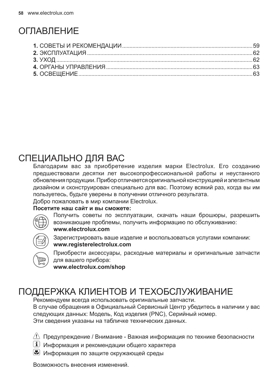 ОГЛАВЛЕНИЕ 1. СОВЕТЫ И РЕКОМЕНДАЦИИ59 2. ЭКСПЛУАТАЦИЯ62 3. УХОД62 4. ОРГАНЫ УПРАВЛЕНИЯ63 5. ОСВЕЩЕНИЕ63