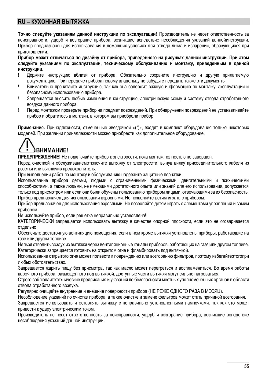 Avant toute opération de nettoyage ou d’entretien, mettez la hotte hors tension en débranchant la prise secteur ou, en cas de raccordement permanent, en désarmant le disjoncteur. Mettez des gants de protection avant d’effectuer toute opération d’installation et d’entretien. Cet appareil n’est pas prévu pour les enfants ou les personnes à capacités physiques, sensorielles ou mentales réduites ou manquant d’expérience et de connaissances. Elles ne pourront l’utiliser que sous la surveillance d'un adulte responsable de leur sécurité et après avoir été mises au courant de son fonctionnement. La hotte est prévue pour des adultes. Surveillez les enfants afin qu’ils ne jouent pas avec l’appareil ou avec ses commandes. Ne mettez jamais la hotte en marche si la grille n'est pas bien en place. Ne déposez AUCUN objet sur la hotte sauf si cela est expressément autorisé. Quand la hotte fonctionne en même temps que d'autres appareils à gaz ou autres combustibles, la cuisine doit disposer d'une ventilation suffisante. L'air aspiré par la hotte ne doit jamais être expulsé dans le conduit d’évacuation des fumées de combustion dégagées par des appareils fonctionnant au gaz ou autres combustibles. Il est formellement interdit de flamber les aliments sous la hotte. Évitez de laisser brûler une flamme nue sous la hotte, car cela peut endommager les filtres et provoquer un incendie. Surveillez vos fritures en permanence, car la graisse ou l’huile surchauffée peut prendre feu. Les parties accessibles de la hotte peuvent devenir assez chaudes quand les appareils de cuisson sont en marche. En ce qui concerne les mesures techniques de sécurité pour l'évacuation des fumées, respectez strictement les réglementations et normes en vigueur dans votre pays. La hotte doit être régulièrement nettoyée, aussi bien à l'intérieur qu'à l'extérieur (AU MOINS UNE FOIS PAR MOIS), et ceci en respectant les instructions d'entretien fournies dans ce manuel. Le non-respect des consignes concernant le nettoyage de la hotte ainsi que le remplacement et le nettoyage des filtres peut entraîner un risque d'incendie. Afin d'éviter tout risque de choc électrique, n'utilisez pas la hotte si les lampes ne sont pas bien en place. Nous déclinons toute responsabilité pour tout dysfonctionnement, dommage ou incendie résultant du non-respect des consignes figurant dans cette notice.