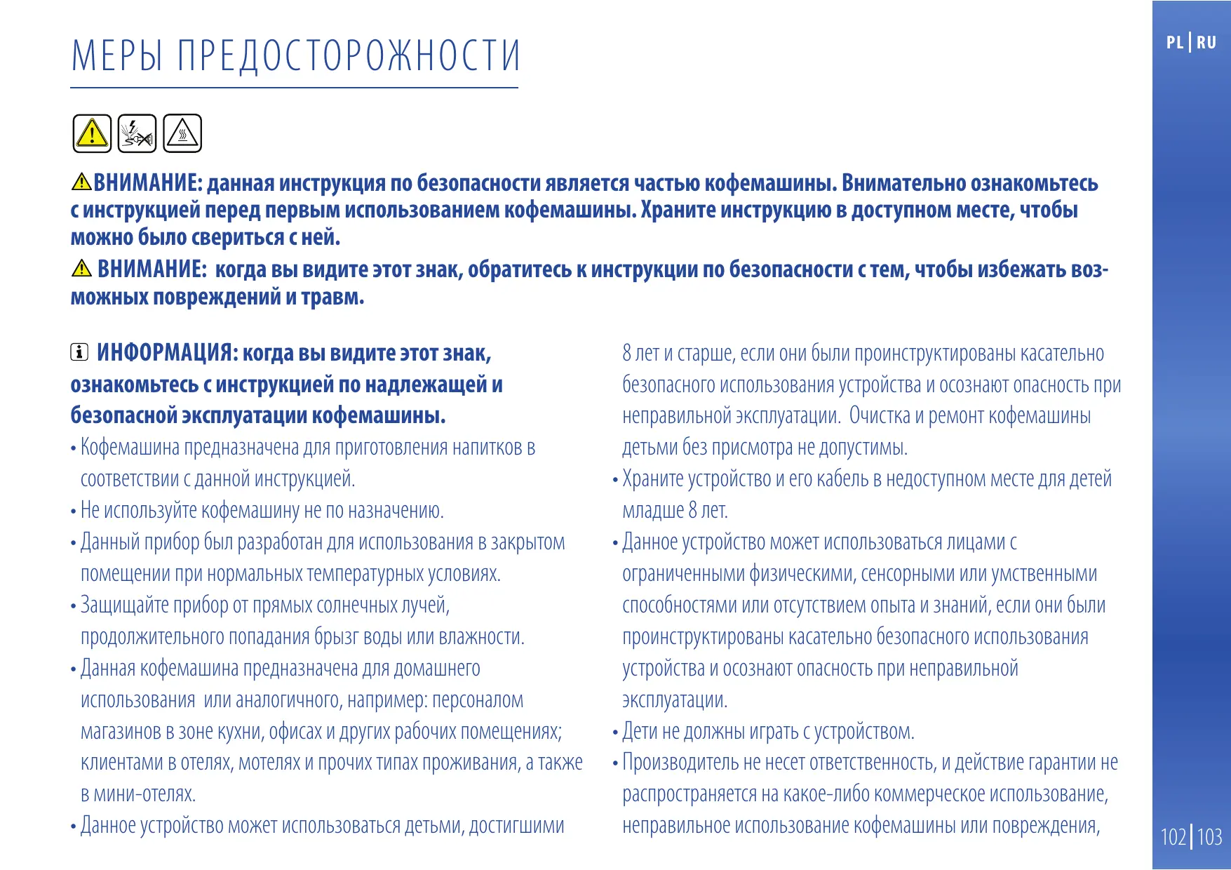Lorsque vous voyez ce symbole, veuillez vous référer au chapitre Précautions importantes afin d’éviter tout risque de blessure ou de dommage. SAFETY PRECAUTIONS/CONSIGNES DE SECURITE OVERVIEW/PRESENTATION SPECIFICATIONS/SPECIFICATIONS ENERGY SAVING MODE/MODE D’ECONOMIE D’ENERGIE FIRST USE OR AFTER LONG PERIOD OF NON-USE/PREMIERE UTILISATION OU APRES UNE LONGUE PERIODE DE NON-UTILISATION COFFEE PREPARATION/PREPARATION DU CAFE PROGRAMMING THE WATER VOLUME/PROGRAMMATION DU VOLUME D’EAU EMPTYING THE SYSTEM BEFORE A PERIOD OF NON-USE AND FOR FROST PROTECTION, OR BEFORE A REPAIR/VIDANGE DU SYSTEME AVANT UNE PERIODE D‘INUTILISATION, POUR LA PROTECTION CONTRE LE GEL OU AVANT UNE REPARATION RESET TO FACTORY SETTINGS/ RESTAURER LES REGLAGES D‘USINE