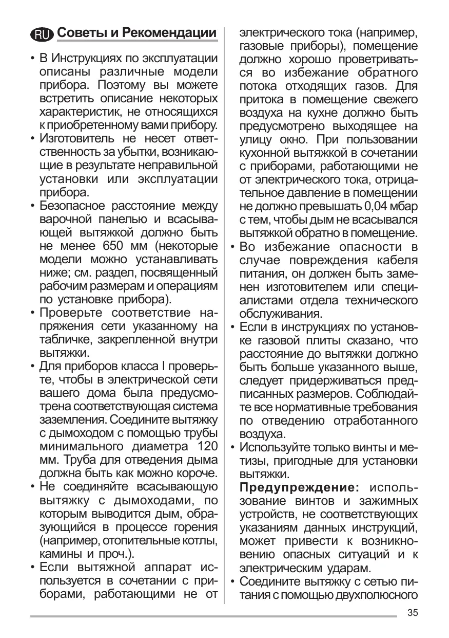 электрического тока (например, газовые приборы), помещение должно хорошо проветриваться во избежание обратного потока отходящих газов. Для притока в помещение свежего воздуха на кухне должно быть предусмотрено выходящее на улицу окно. При пользовании кухонной вытяжкой в сочетании с приборами, работающими не от электрического тока, отрицательное давление в помещении не должно превышать 0,04 мбар с тем, чтобы дым не всасывался вытяжкой обратно в помещение. Во избежание опасности в случае повреждения кабеля питания, он должен быть заменен изготовителем или специалистами отдела технического обслуживания. Если в инструкциях по установке газовой плиты сказано, что расстояние до вытяжки должно быть больше указанного выше, следует придерживаться предписанных размеров. Соблюдайте все нормативные требования по отведению отработанного воздуха. Используйте только винты и метизы, пригодные для установки вытяжки. Предупреждение: использование винтов и зажимных устройств, не соответствующих указаниям данных инструкций, может привести к возникновению опасных ситуаций и к электрическим ударам. Соедините вытяжку с сетью питания с помощью двухполюсного 35