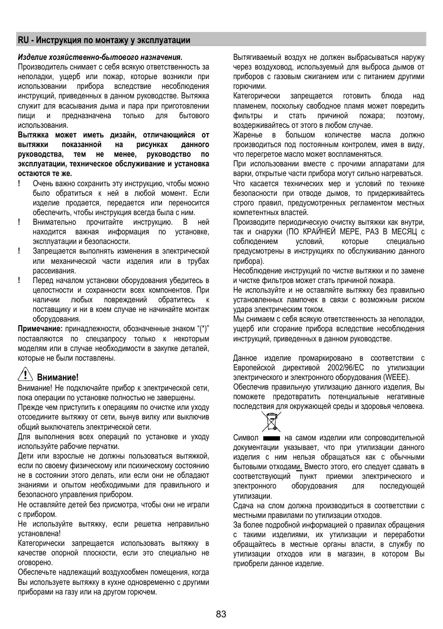 Attention! Ne pas raccorder l’appareil au circuit électrique avant que le montage ne soit complètement terminé. Avant toute opération de nettoyage ou d’entretien, débrancher la hotte du circuit électrique en retirant la prise ou en coupant l’interrupteur général de l’habitation. Munissez-vous de gants de travail avant d’effectuer toute opération d’installation et d’entretien. L’appareil n’est pas destiné à une utilisation par des enfants ou des personnes à capacités physiques, sensorielles ou mentales réduites et sans expérience et connaissance à moins qu’ils ne soient sous la supervision ou formés sur l’utilisation de l’appareil par une personne responsable de leur sécurité. Les enfants doivent être surveillés afin qu’ils ne jouent pas avec l’appareil. Ne jamais utiliser la hotte sans que la grille ne soit montée correctement! La hotte ne doit JAMAIS être utilisée comme plan pour déposer quelque chose sauf si cela est expressément indiqué. Quand la hotte est utilisée en même temps que d’autres appareils à combustion de gaz ou d’autres combustibles, le local doit disposer d’une ventilation suffisante. L’air aspiré ne doit jamais être envoyé dans un conduit utilisé pour l’évacuation des fumées produites par des appareils à combustion de gaz ou d’autres combustibles. Il est formellement interdit de faire flamber les aliments sous la hotte.