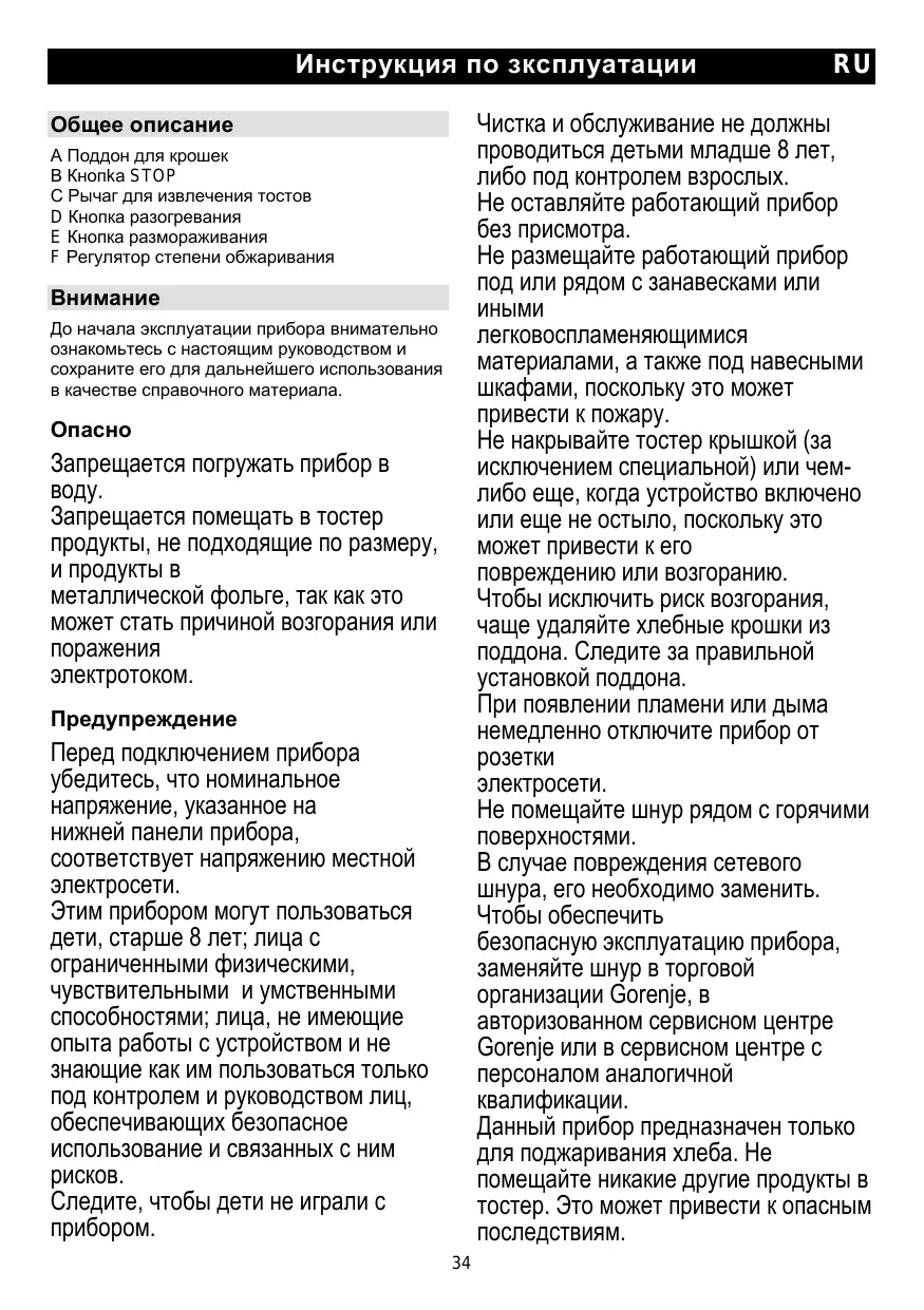 YnCTka n OBCnyKbAHne He DoJIxHbI npOBOnTbcra DeTbMm MnaAdue 8 JeT, Jn6o NOD KOHTPOJEM B3PocJIbIX. He octabJyIte pa6OaUcHn np6Op 6e3 npncMOtpa. He pa3MeaIte pa6OaUcHn np6Op Iod nIIN PRAOM C 3aHaBeCKAMn INn INhIMN JERKOBOCnIaMeHЯUcMMNCr MaTeRnAImn, a TAKKe IOD HaBeCHbIMN ShKaΦamn, NOCKoJIbKy 3TO MOXET npNBecTNI K NOXAPy. He hakpbIbAIte TOCTep KpbIuKoI (3a NCKJIIOUeHHeM CNEuaJIbHO) INI YeMILNoEe, KOrDa UCTPOJcTB WkLIQUeHo INIe He OCTbIIO, NOCKoJIbKy 3TO MOXET npNBecTNI K ERO NOBpeXDeHIno INI IN Bo3rOpAHIO. UTo6bl NCKIIOUHTb PnCK BO3rOpAHn, qASe ydaIaNTE XNe6HbIE KPOsKn IN3 IODOna. CJeDNTe 3a npABINbHOYCTAHOBKO IODOna. IPrn IOBLeHn INIaMeHn INI IN IbIMa HemeJInHO OTKIOUHTe pnp6Op OT PO3ETKN 3JIeKTPocETN. He IomEsauIte shHyp prdOM c ropqHMn NOBepxHOCTaMn. B Cnyae NOBpeXdeHn CTeBoro SHynpa, erO Heo6xoJIMO 3AmEHNTb. UTo6bl ObecneHTb 6e3ONaChyU 3KcPnPyatauHIO np6Opa, 3aMeHnIte shHyp B TropBOOJ opraHn3aCmGorenje, B ABTOpN3OBAHHOM cepBvICHOM ceHTpe Gorenje INI B cepBvICHOM ceHTpe C nepcoHaON mAnlORNuHOB KBaJIINФukaCm. DAnHbI np6Op PrdHa3NaUeH ToJIbKO dIy NODJxapRBANHy xNe6a. He IomEsauIte HIKAKne DpyrVe npOdyKTbIB TOCTep. 3TO MOXET npNBecT N OPAChbIM NOCJIeDCTBnM.